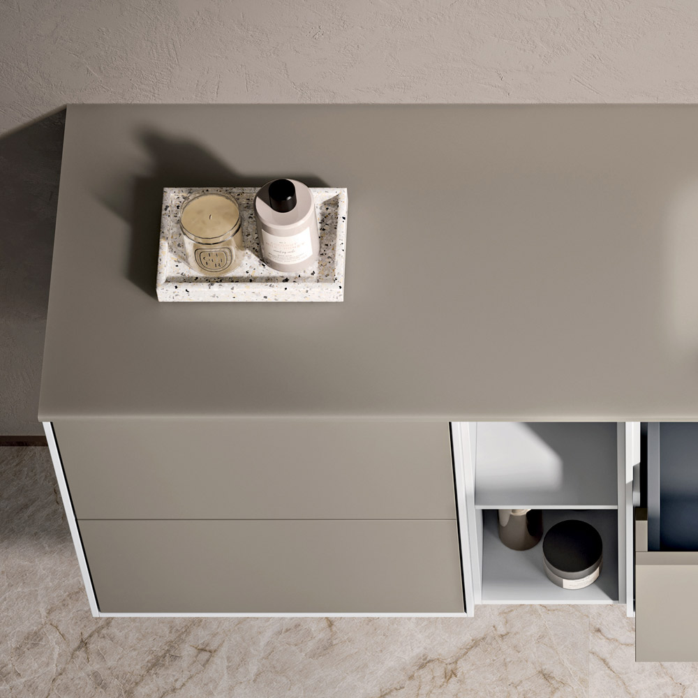 Una solución perfecta para quien busca un mueble de baño suspendido moderno en color gris paloma , capaz de combinar una estética minimalista, materiales refinados y la máxima practicidad cotidiana.