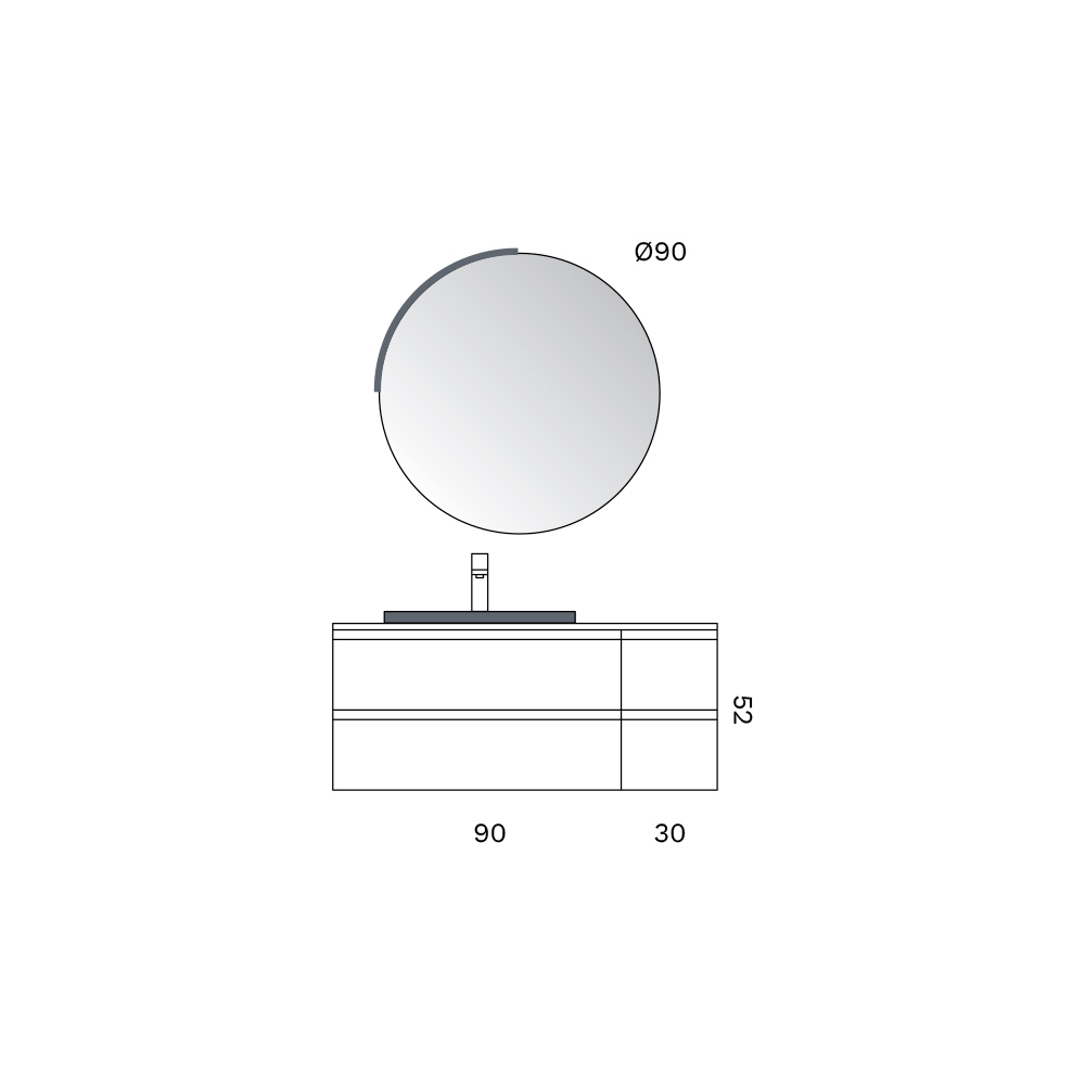 El espejo redondo , de proporciones equilibradas, completa el conjunto con un toque de ligereza visual, amplificando el espacio y dialogando armoniosamente con las líneas rigurosas del mobiliario.