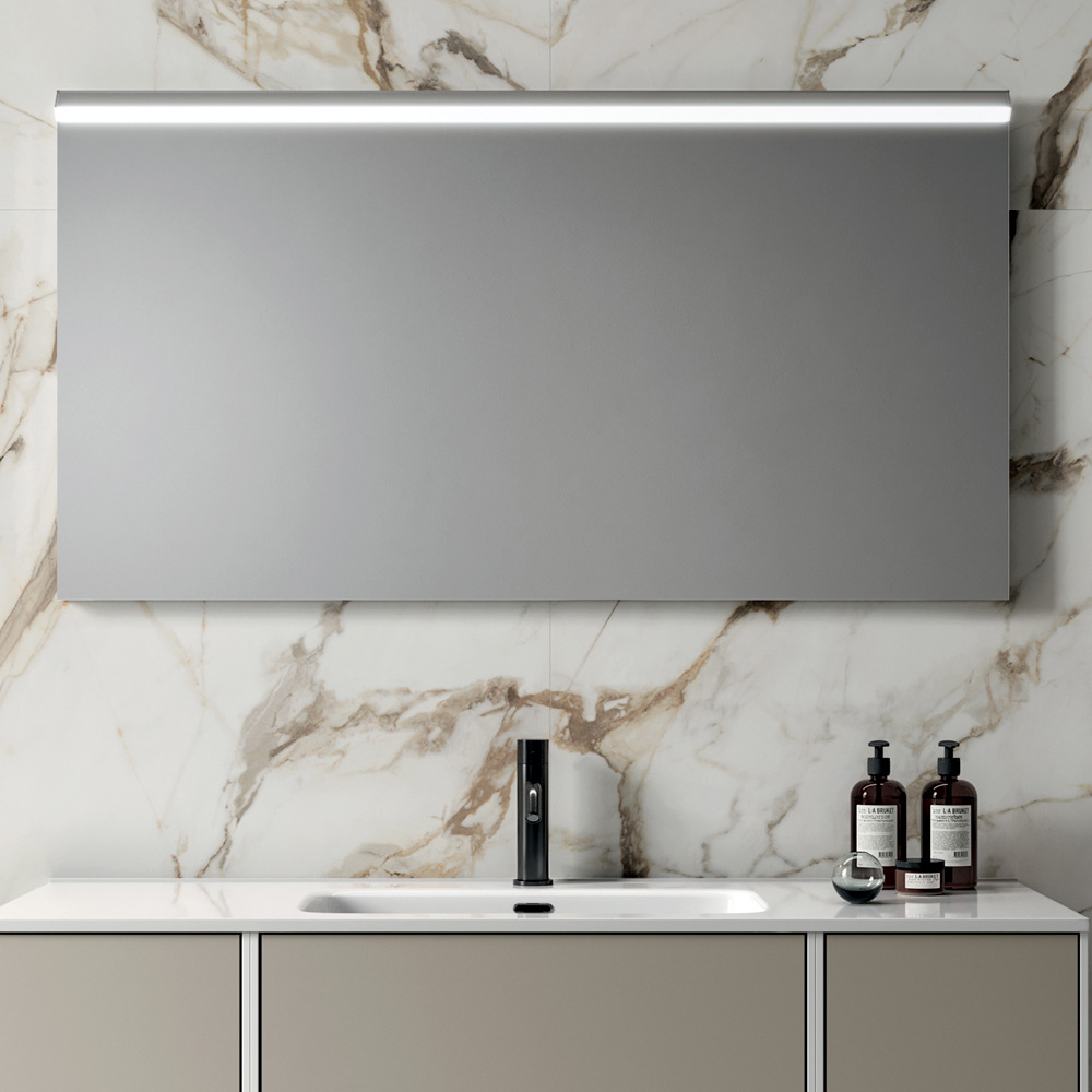 El lavabo de cerámica blanca brillante aporta luminosidad y contraste, a la vez que garantiza durabilidad y facilidad de mantenimiento. Completando la composición, el espejo LED con iluminación integrada realza el espacio y crea un ambiente elegante y contemporáneo.