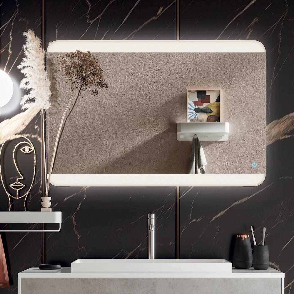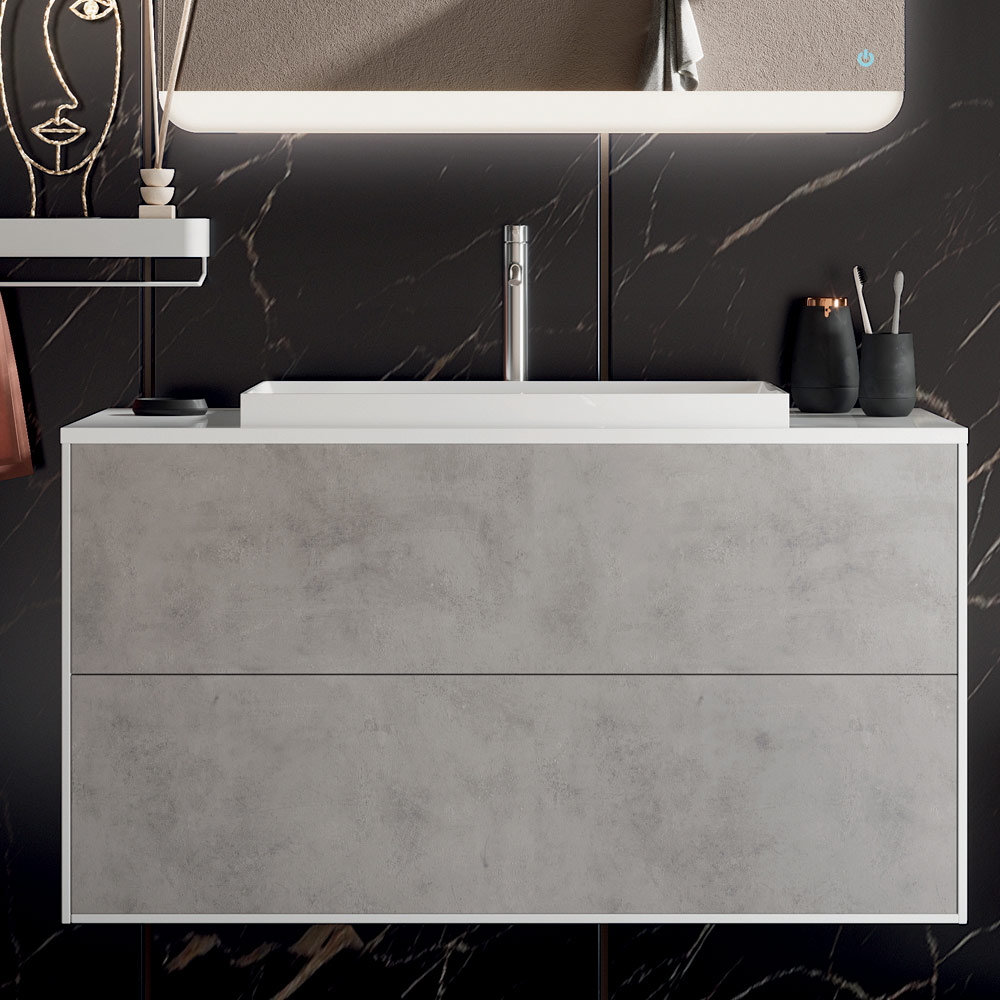 Composición de baño completa con lavaboencastrable de resina , espejo de cristal con LED frontal y perimetral y basede melamina antirrayas color cemento con 2 cajones totalmente extraíbles y cierre suave. La colección de estilo moderno recuerda los conceptos de ligereza y simplicidad esencial. Acabados y materiales se unen para crear un mueble de baño elegante, de calidad y funcional.