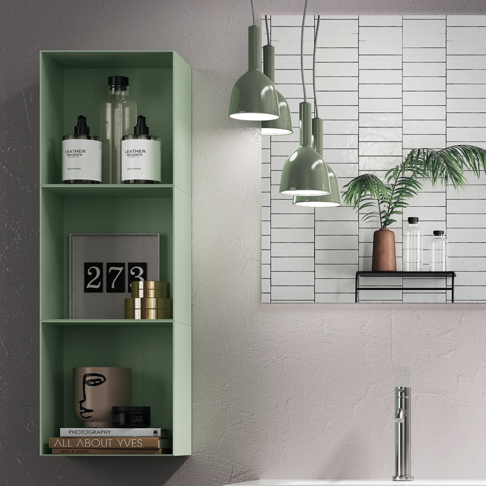 Composición de baño con basede melamina resistente a los arañazos color roble mielcon 2 cajones totalmente extraíbles y cierre suave , espejo rectangular con lámpara y lavabo doble consola en cerámica blanca brillo . También se incluyen los 3 cubos suspendidos en metal lacado verde pálido RAL6021. Los detalles de la estructura y los cajones push-pull se combinan con gran elegancia, otorgando a la estructura la capacidad de adaptarse a cada necesidad. La combinación de materiales y acabados crea un producto único que satisface las necesidades de calidad, estilo y funcionalidad.