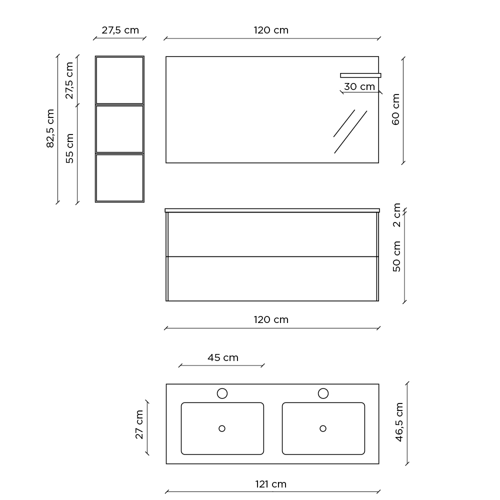 Dimensiones: Base: Largo 121 cm x Fondo 46,5 cm x Alto 52 cm Lavabo: L 45 cm x P 27 cm Espejo: Alto 60 cm x Ancho 120 cm