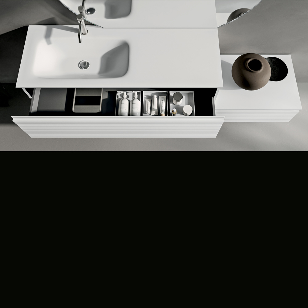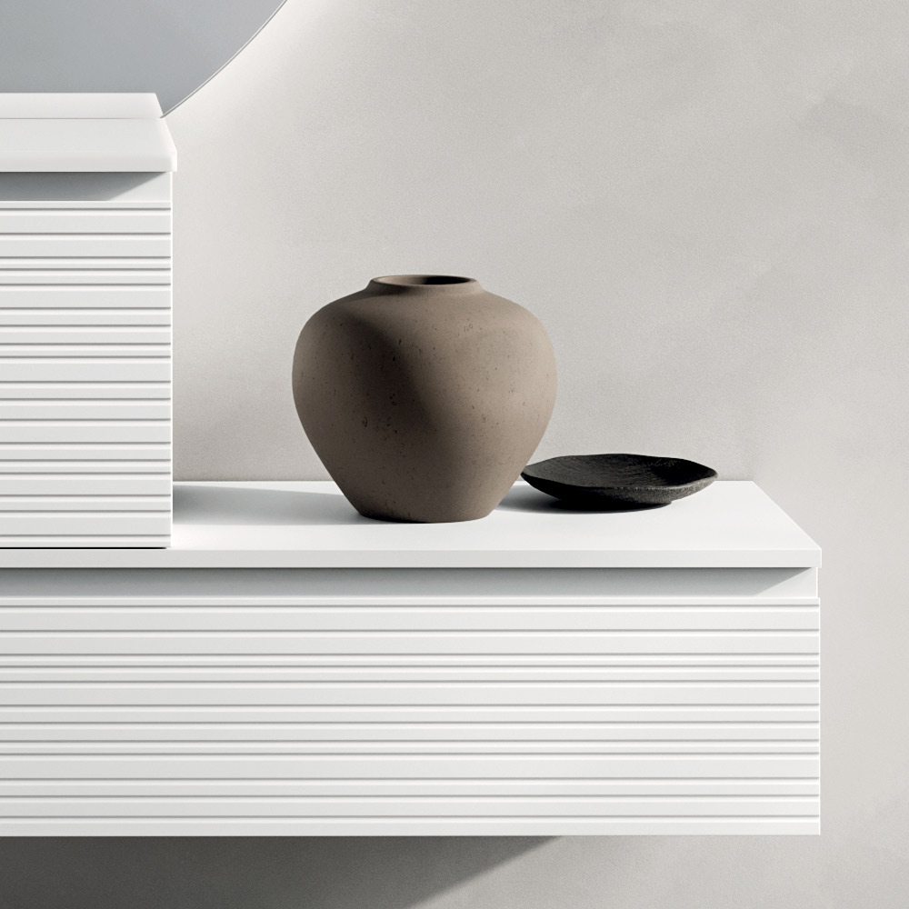 El mueble de baño suspendido blanco mate presenta líneas limpias y proporciones equilibradas, ofreciendo una solución de almacenamiento funcional y discreta. El acabado mate realza la pureza del color, lo que lo convierte en una composición ideal tanto para espacios residenciales como para proyectos de alta gama.