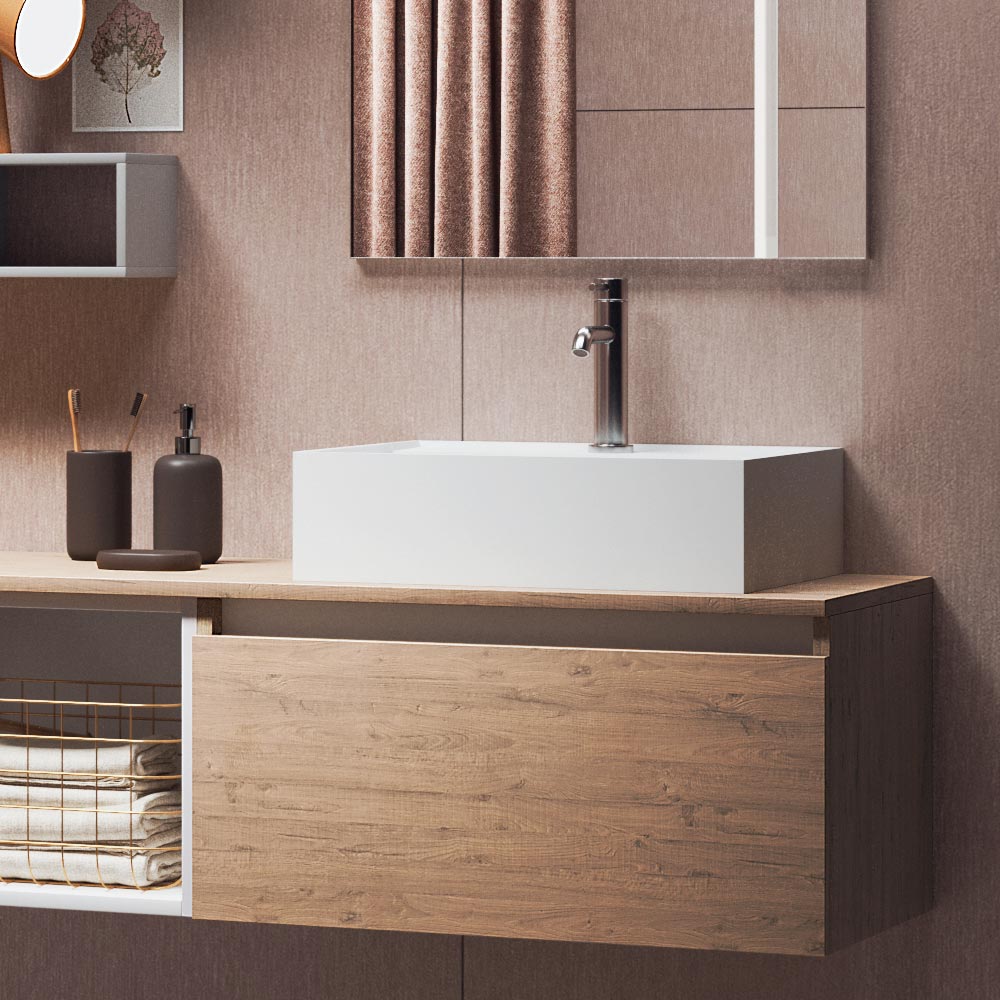 Líneas decisivas y limpias se unen en esta combinación de productos para darle al baño un estilo refinado y elegante. No renuncias a la funcionalidad y la practicidad gracias al compartimento de almacenamiento y al cómodo cajón y a los materiales elegidos para su construcción.