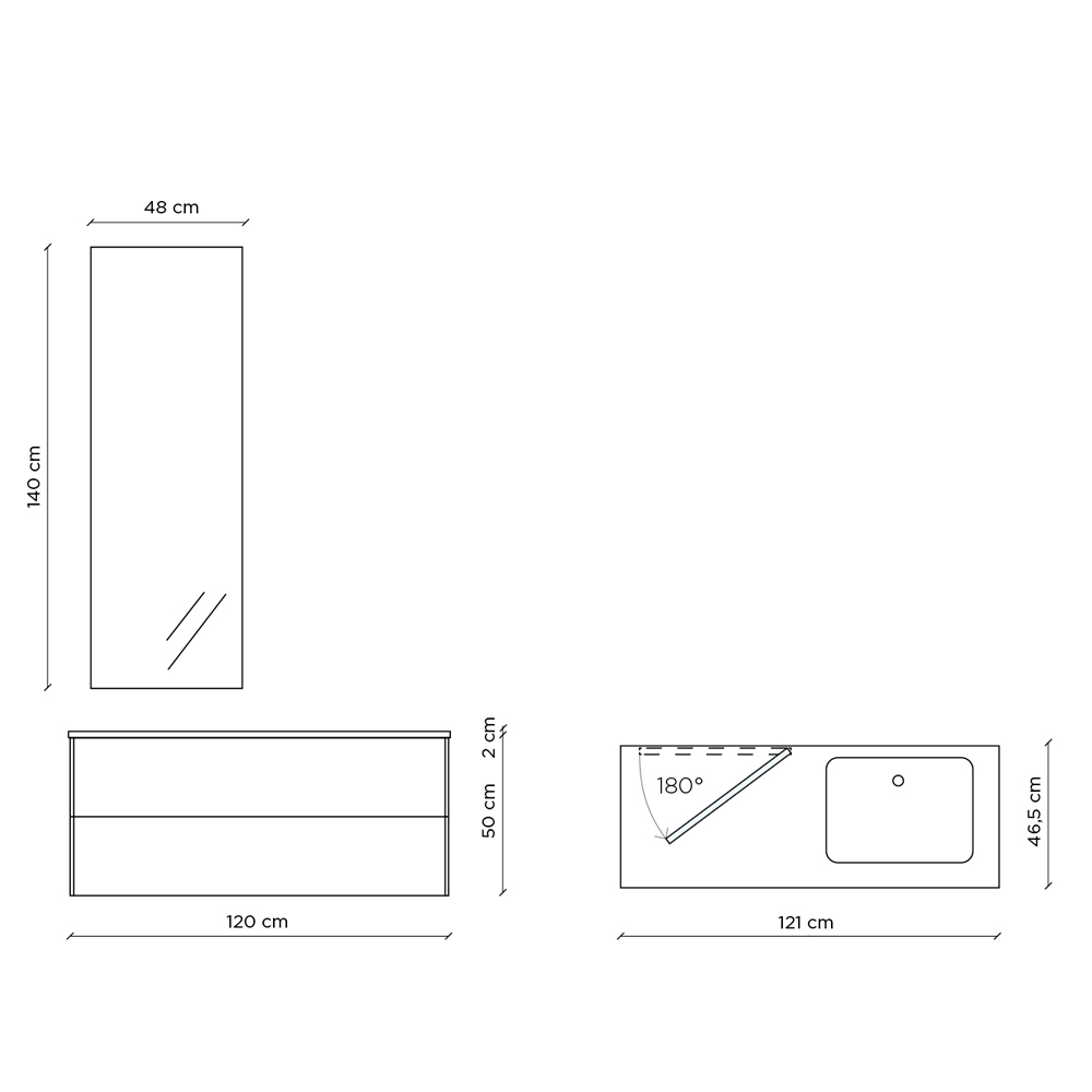 Dimensiones: Base: Largo 120 cm x Fondo 46,5 cm x Alto 52 cm Espejo: Alto 140 cm x Ancho 48 cm