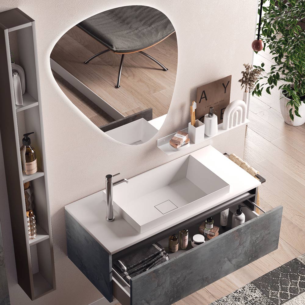 Composición de baño con espejo moderno con LED perimetral, base en melamina óxido antirrayas con cajón totalmente extraíble y cierre suave y lavabo en cerámica blanca mate Made in Italy. Base disponible en varios acabados.
