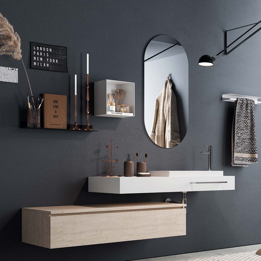 Composición de baño fabricada en Italia compuesta por espejo ovalado de cristal , base de melamina resistente a los arañazos color roble natural con cajón metálico totalmente extraíble y cierre suave . Encimera en mdf revestido y hpl blanco brillo sobre la que apoya un lavabo de resina blanca.