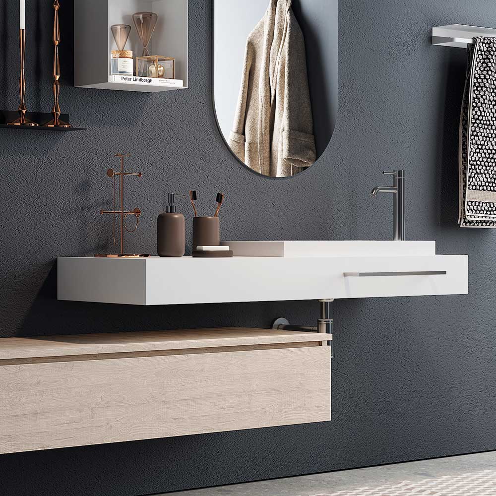 Composición de baño de estilo moderno y minimalista que responde a las necesidades de todos aquellos que quieren amueblar su baño con gusto y refinamiento. La combinación de materiales y colores hacen que estos productos sean únicos y garantizan la calidad y resistencia que caracterizan a todos los muebles de baño.