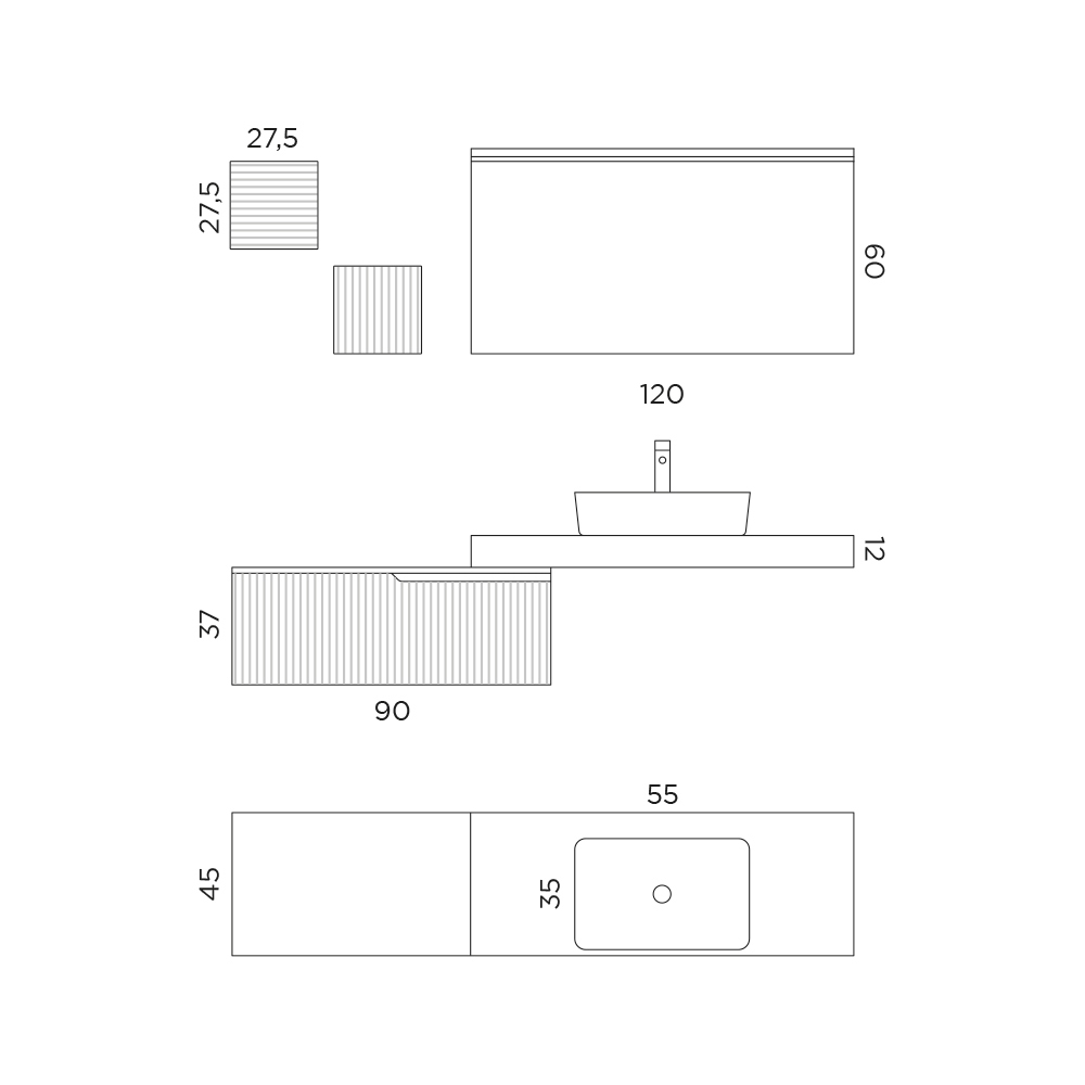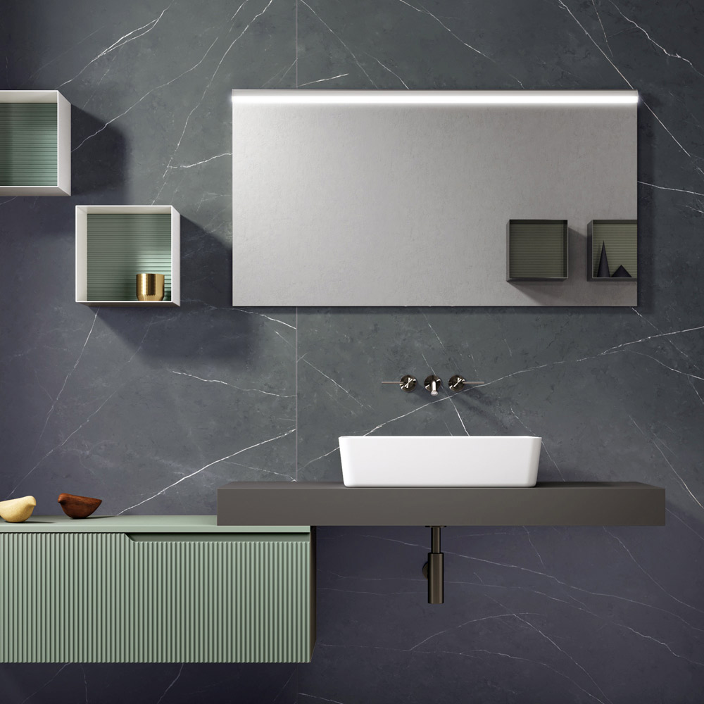 Composición de baño íntegramente fabricada en Italia compuesta por base con 1 cajón en MDF con acabado acanalado verde salvia, encimera tipo cajón antracita, lavabo de cerámica blanca, espejo con luz LED frontal única, 2 muebles altos de metal blanco y fondo acanalado verde salvia. Es una solución de decoración adaptable a múltiples configuraciones de uso y particularmente versátil, nacida de la unión entre la atención al detalle y la búsqueda de un diseño esencial.