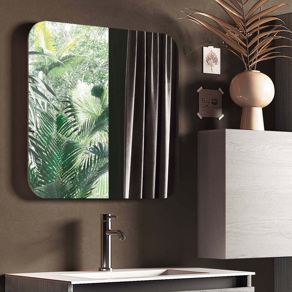 Composición de baño con espejo cuadrado con esquinas redondeadas, base en roble fresno resistente a rayones con cajón totalmente extraíble y cierre suave y lavabo encastrable en resina blanca brillo Made in Italy.