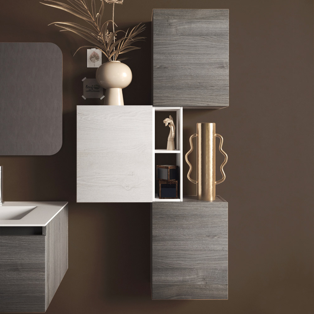 También se incluyen los 3 muebles altos con puertas, dos en roble fresno y uno en roble Alaska y el mueble alto con 2 compartimentos abiertos en metal lacado blanco brillo.