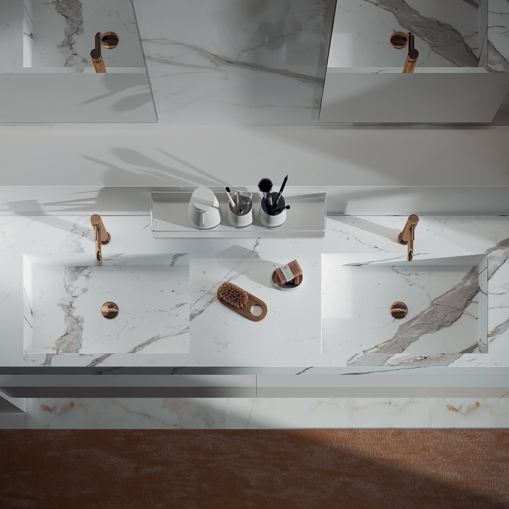 Composición de baño doble con doble espejo rectangular de cristal , base de melamina antirrayas blanco brillo con tres cajones con cierre amortiguado y tapa tipo box de HPL con doble lavabo integrado color calacatta .