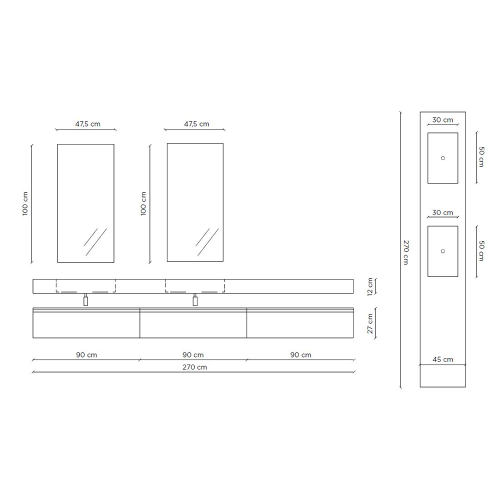 Parte superior: Largo 270 cm x Alto 12 cm x Fondo 45 cm
