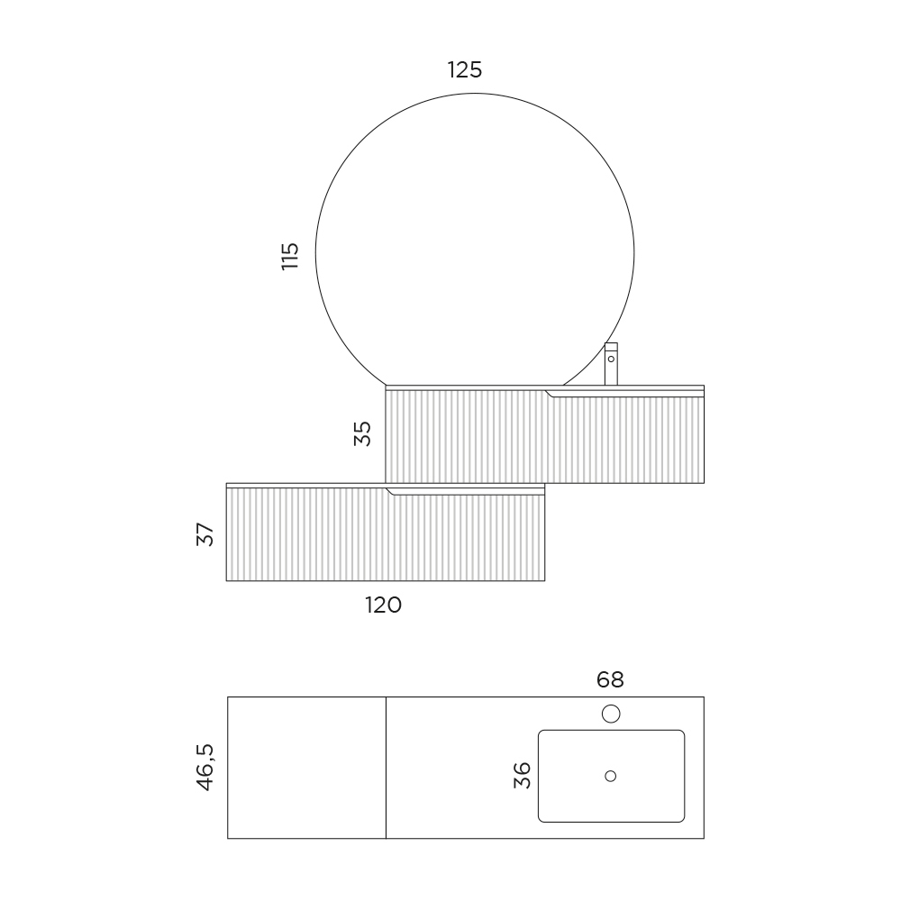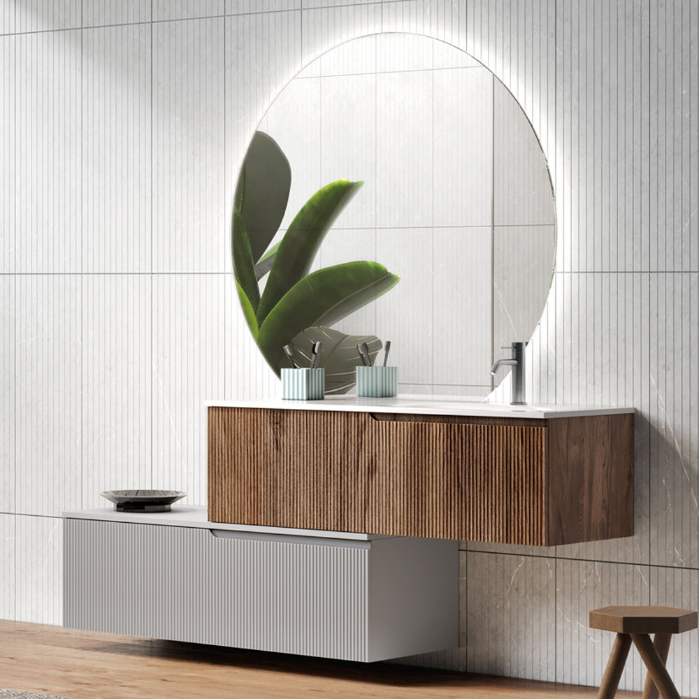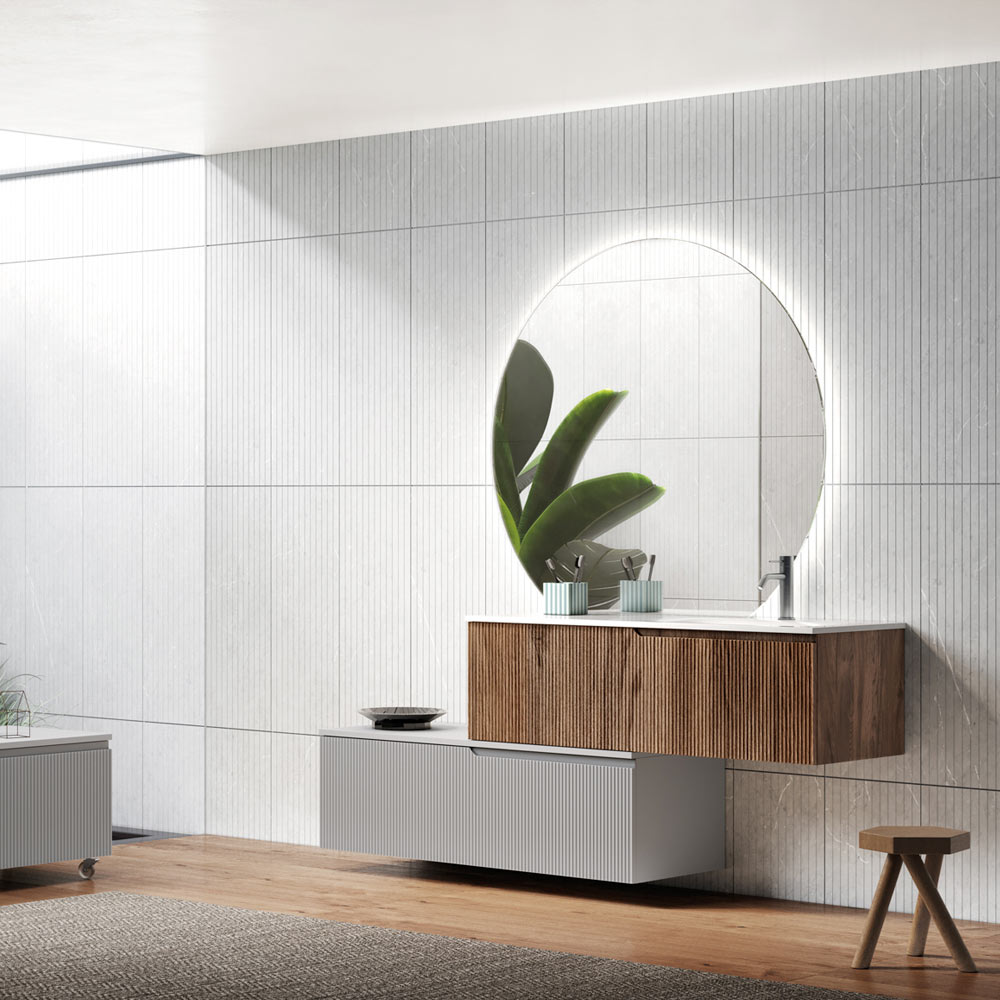 Composición de baño íntegramente fabricada en Italia compuesta por base con 1 cajón en MDF acanalado gris y tapa en MDF blanco, base con 1 cajón en roble Rio acanalado, lavabo de cerámica blanca, espejo con luz LED perimetral. Esta composición de muebles de baño pretende combinar el diseño contemporáneo con la tradición italiana. Nacen así productos emocionales que materializan la experiencia elegante y placentera del ambiente del baño, a través de la exaltación de los valores de los materiales utilizados, como la investigación y la innovación.