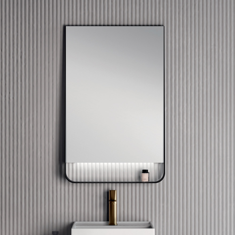 Completa el conjunto el espejo de baño LED Wing con marco negro mate , un elemento de fuerte personalidad que asegura una iluminación funcional y a la vez decorativa, realzando toda la zona del lavabo.