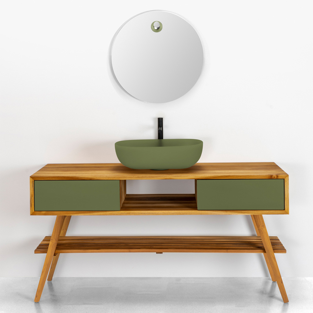 Mueble de baño compuesto por lavabo en resina y mueble en teca y caoba.