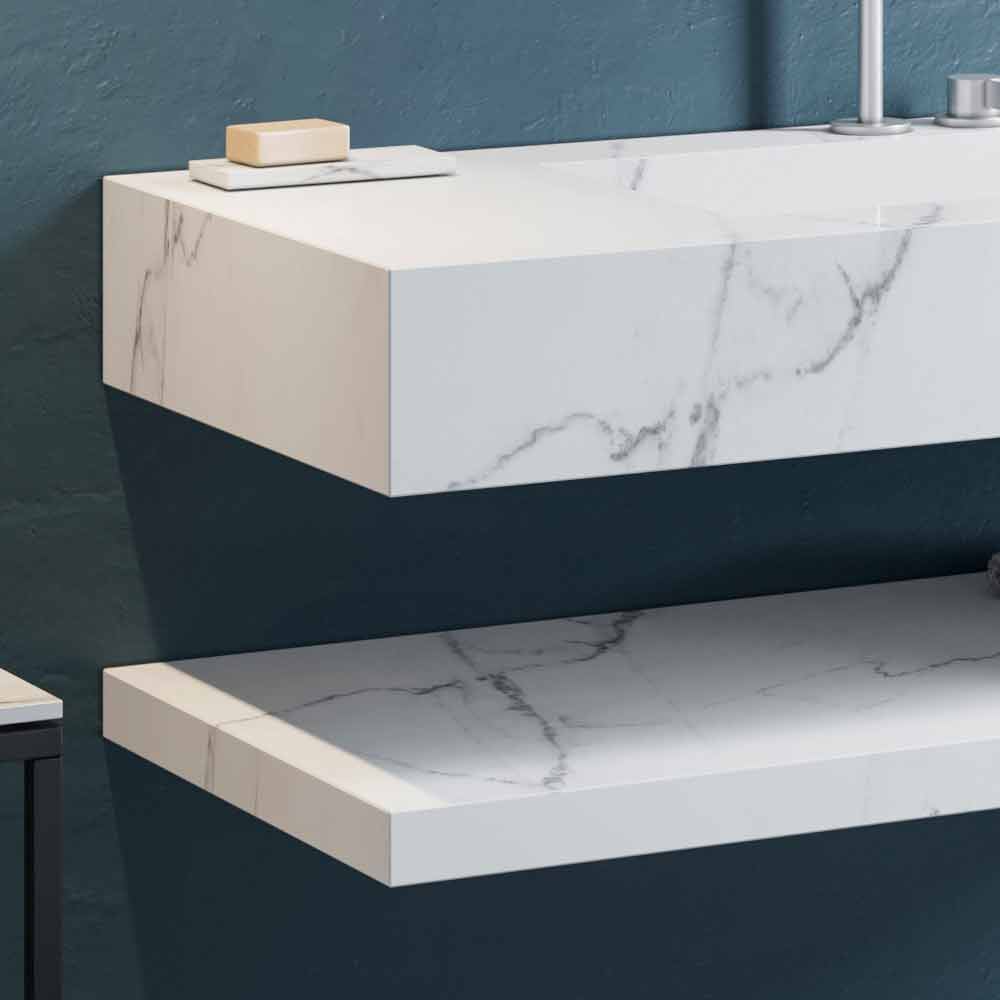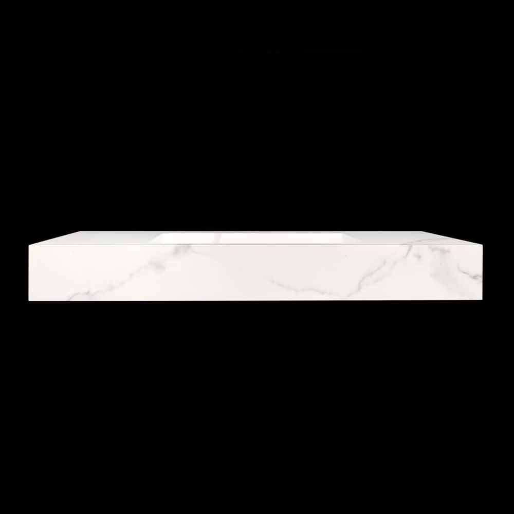 La consola suspendida y la balda están fabricadas en gres porcelánico disponible en 4 acabados. El lavabo integrado está equipado con un desagüe universal de 7,1 cm hacia arriba y hacia abajo / desagüe libre sin orificio de rebose.