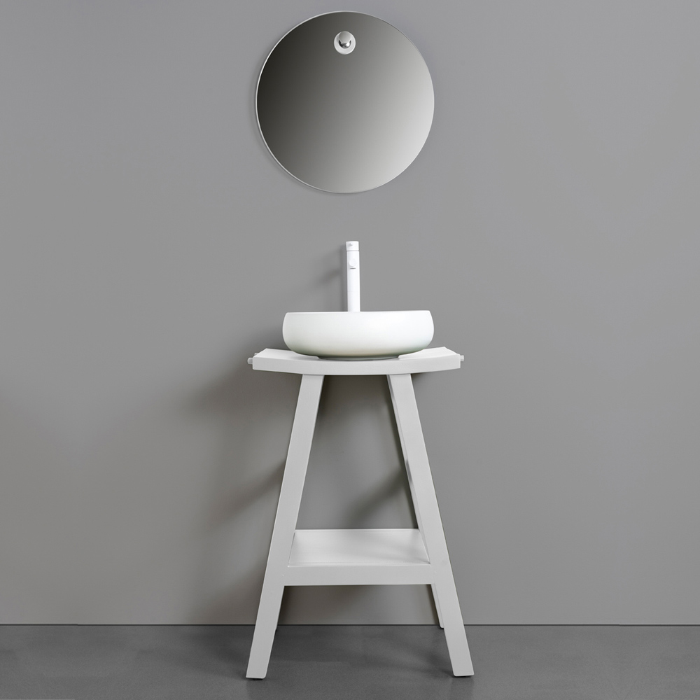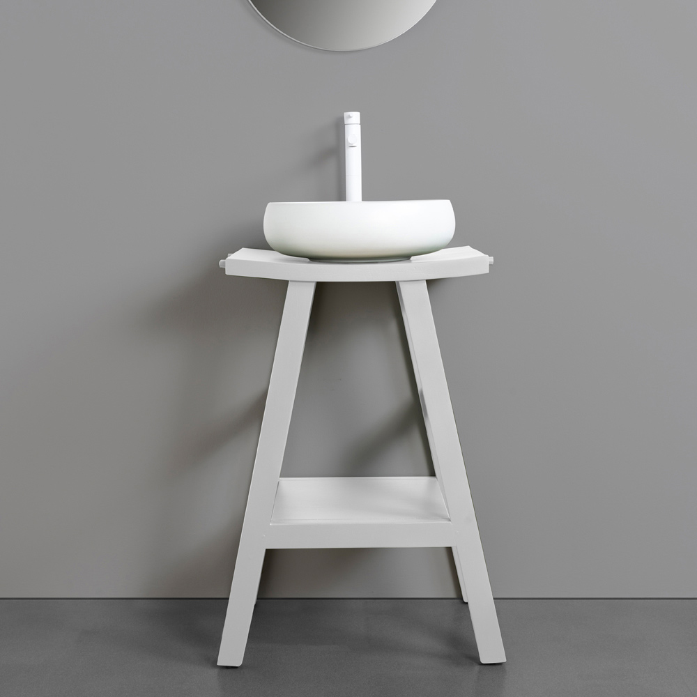 Composición de baño con mueble de suelo de teca, lavabo de barro y accesorios.