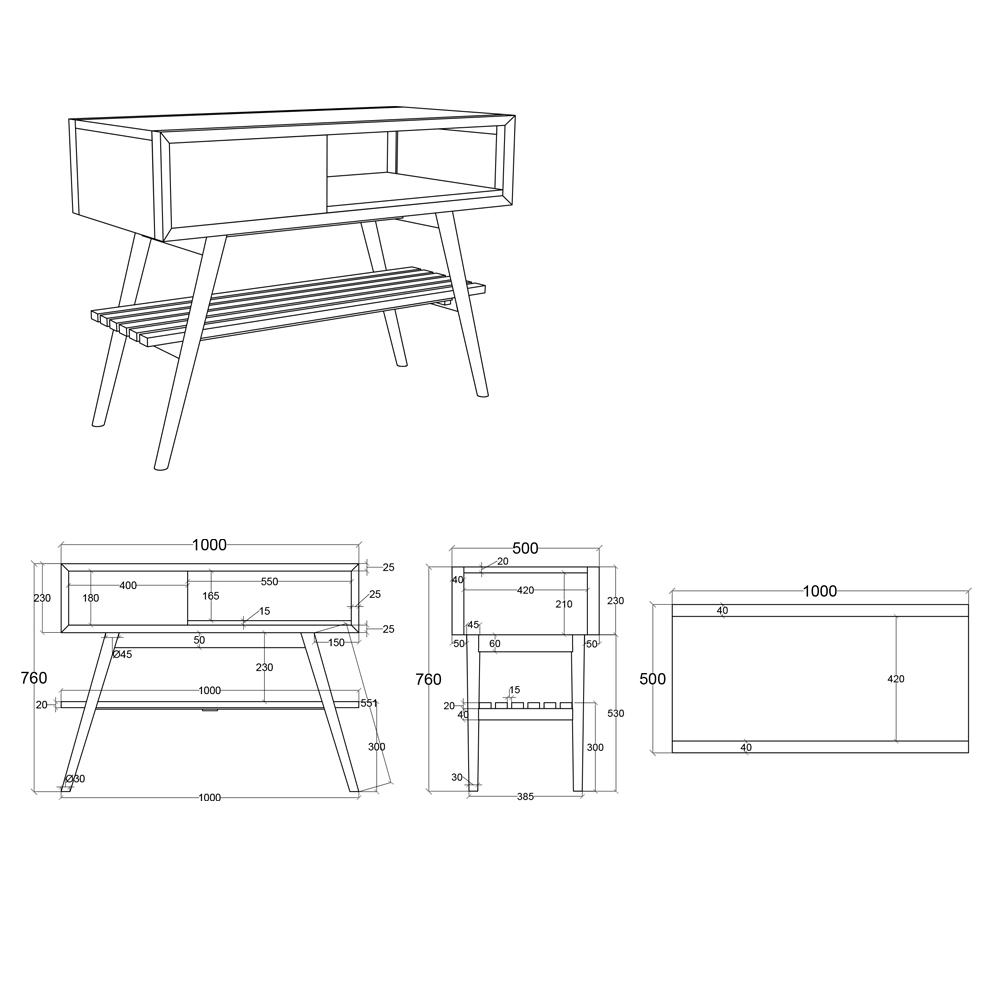 mueble de suelo de teca natural reciclada con cajonera lateral en madera de caoba pintada de azul y