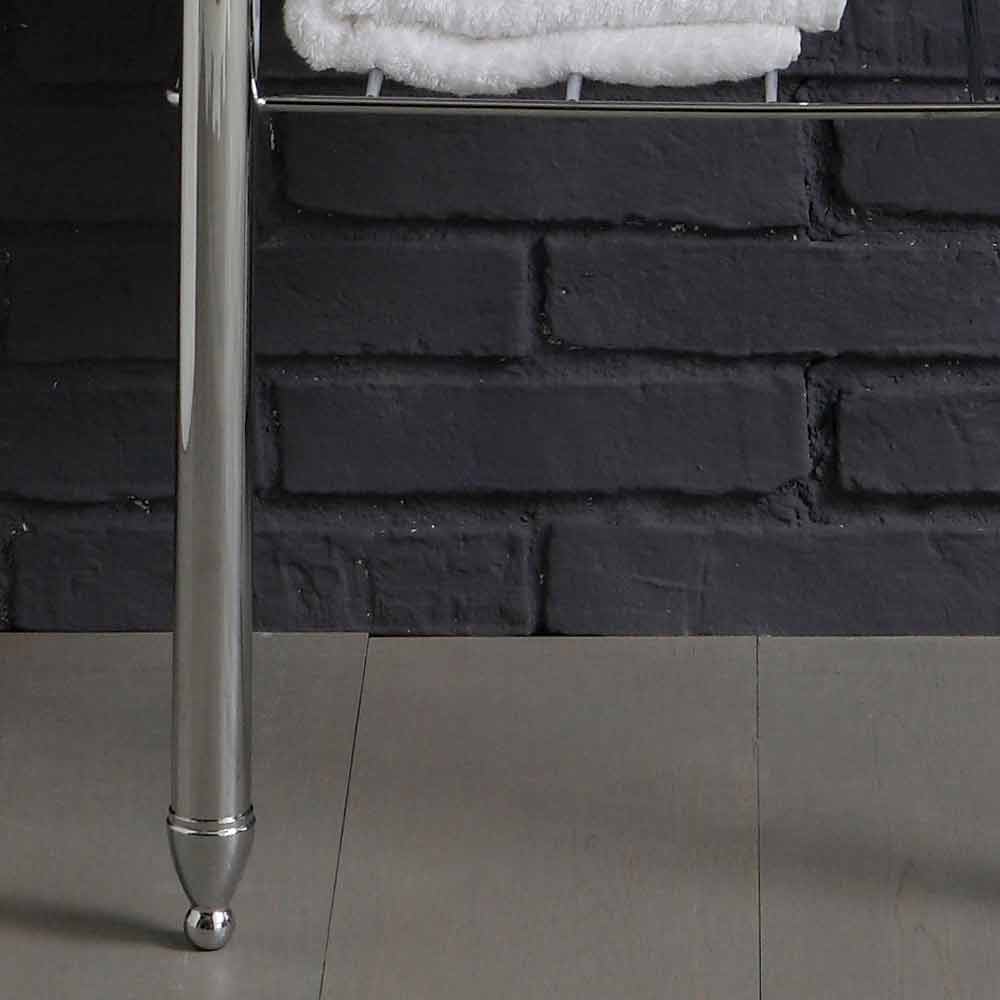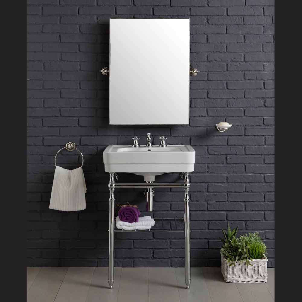 Partes incluidas en la composición: - Lavabo de cerámica blanca. Medidas: L.50 cm x P.40,5 cm - Base de metal completa con rejilla, en acabado cromado L.41 cm x A.76 cm x saliente de pared 34 cm - Grifo con desagüe - Sifón - Drenar - Espejo basculante rectangular con marco de latón cromado 76,5 cm x 57,5 cm. - Toallero de anillo - Jabonera de cerámica de pared