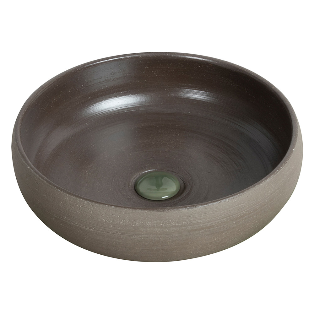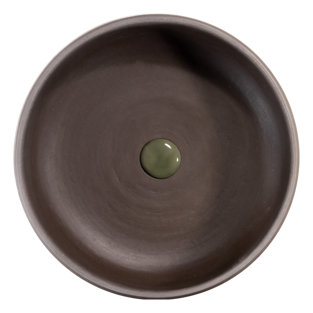 El lavabo sobre encimera realizado en arcilla refractaria y tierra oscura con cubrecama verde, es un producto íntegramente Made in Italy con formas suaves y sinuosas que combina funcionalidad y estilo inconfundible. El espejo de pared incluido en los accesorios de baño, fabricado en Italia, se completa con un orificio para colgar, acabado con un anillo de teca verde torneado a mano e incluye un gancho cromado .