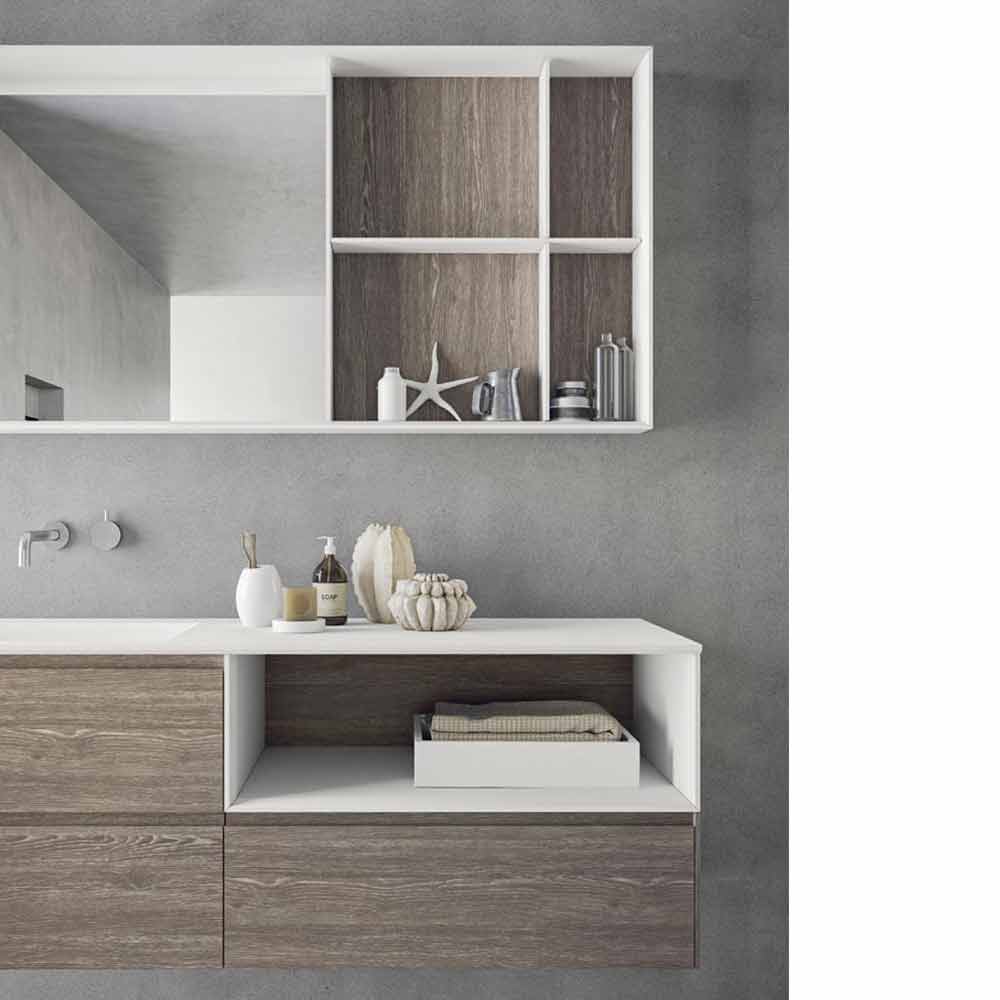 Finalmente, la composición se ofrece en una serie de nuevos acabados que incluyen laminados HPL Unicolor con decoraciones que simulan el roble en cuatro tonalidades diferentes y la piedra en tres tonalidades naturales. Para acompañarlos, una amplia gama de lacados que tienen como objetivo crear un programa completo capaz de satisfacer un amplio abanico de usuarios y tipologías espaciales.