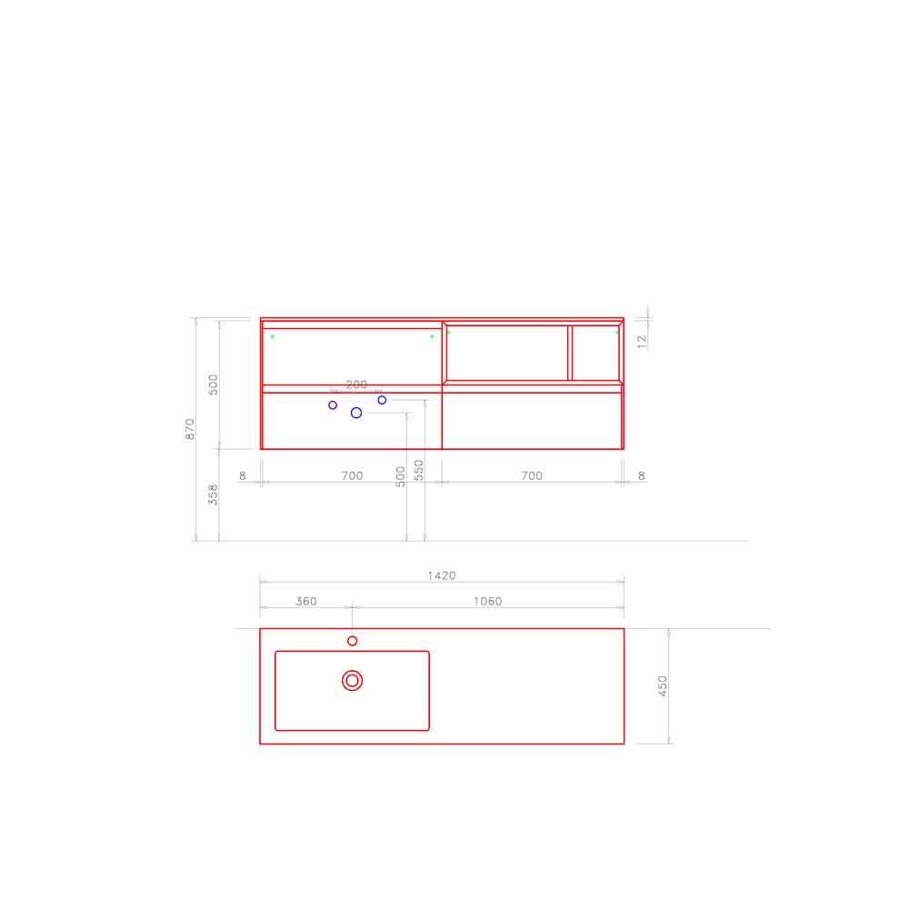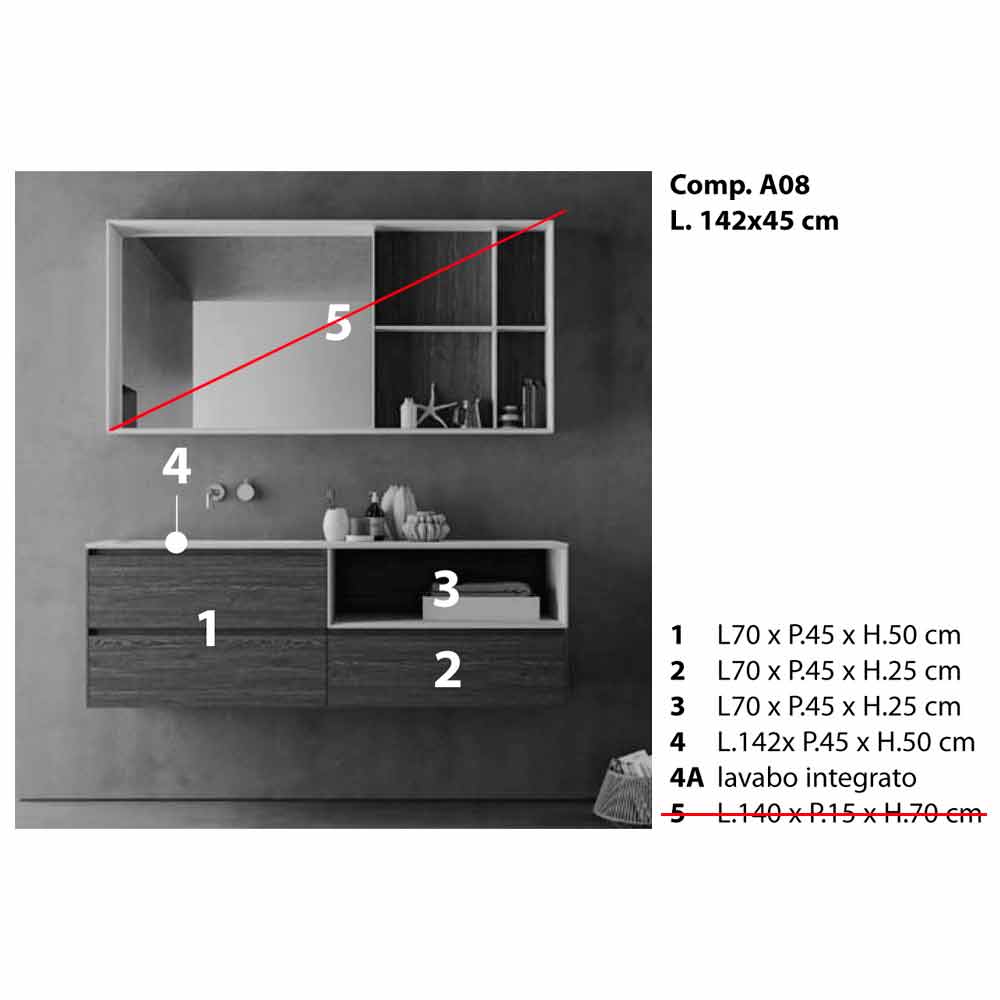 La composición incluye: 1 L70 x P.45 x H.50 cm 2 L70 x P.45 x H.25 cm 3 L70 x P.45 x H.25 cm 4 L.142x P.45 x H.50 cm Lavabo integrado 4A