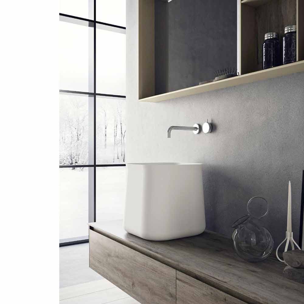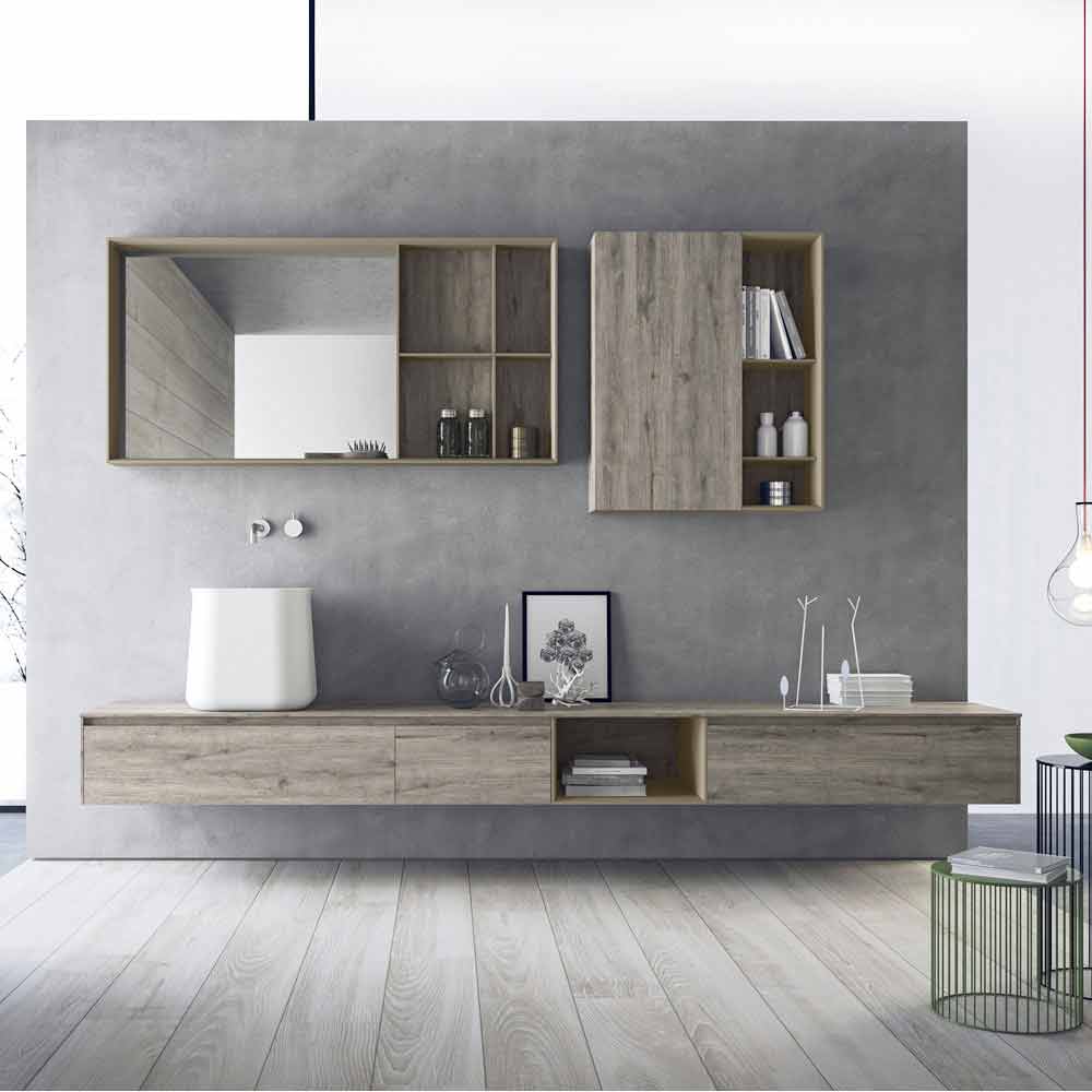 Composición de moderno mueble de baño, diseño suspendido y de brazos largos con lavabo sobre encimera, made in Italy.