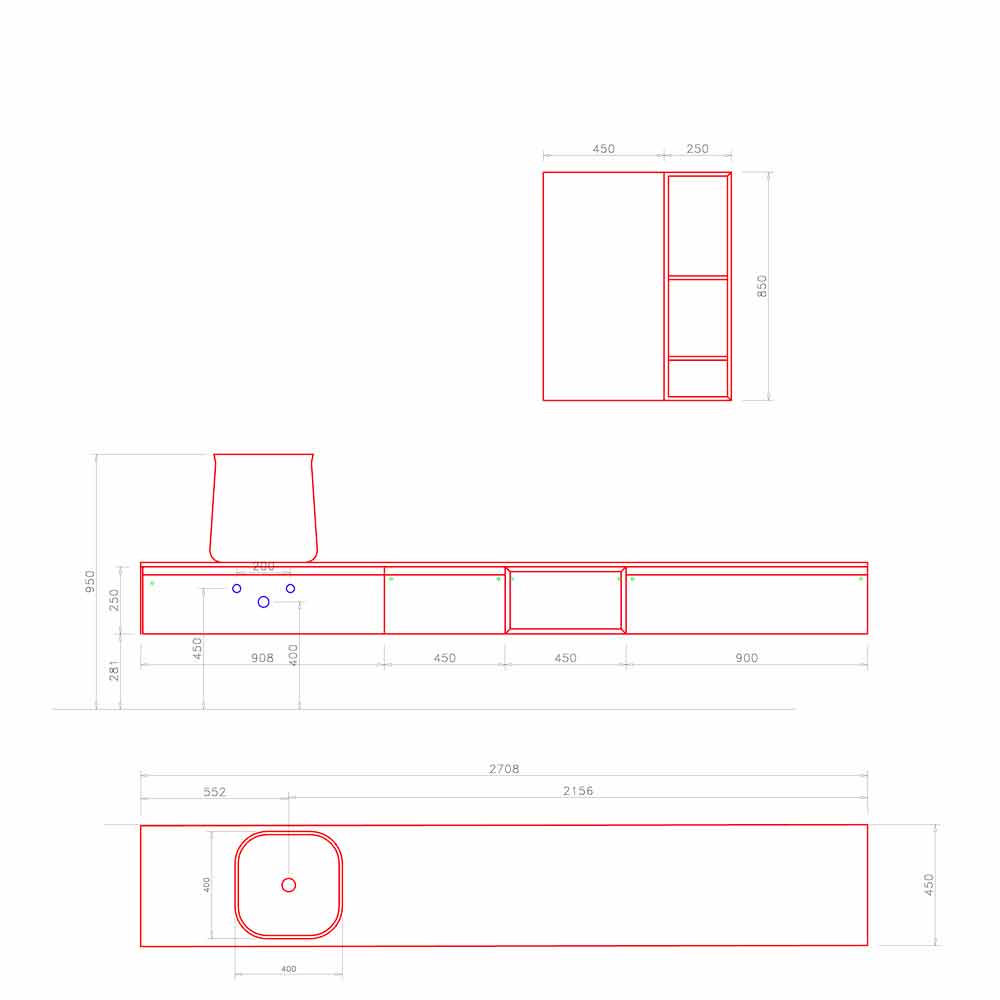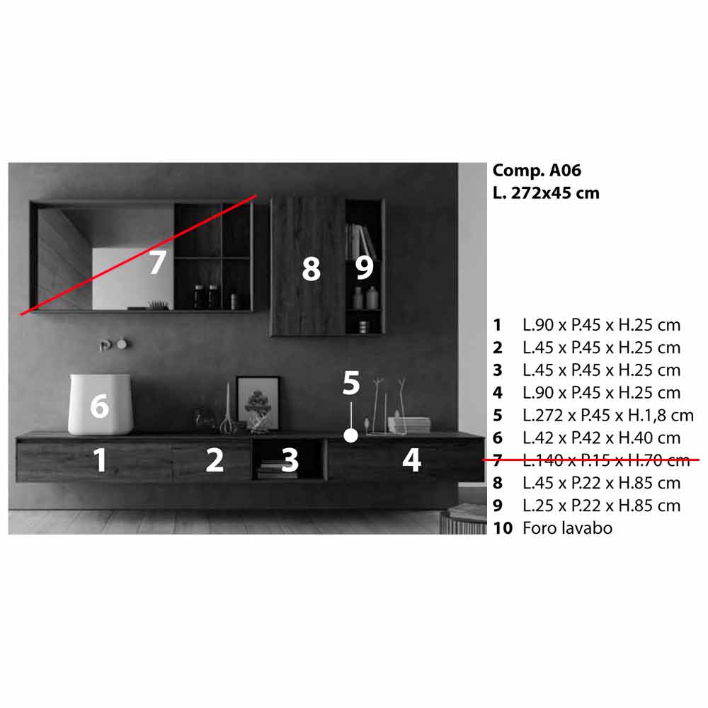 La composición incluye: 1 L.90 x P.45 x H.25 cm 2 L.45 x P.45 x H.25 cm 3 L.45 x P.45 x H.25 cm 4 L.90 x P.45 x H.25 cm 5 L.272 x P.45 x H.1,8 cm 6 L.42 x P.42 x H.40 cm 8 L.45 x P.22 x H.85 cm 9 L.25 x P.22 x H.85 cm 10 Orificio para lavabo