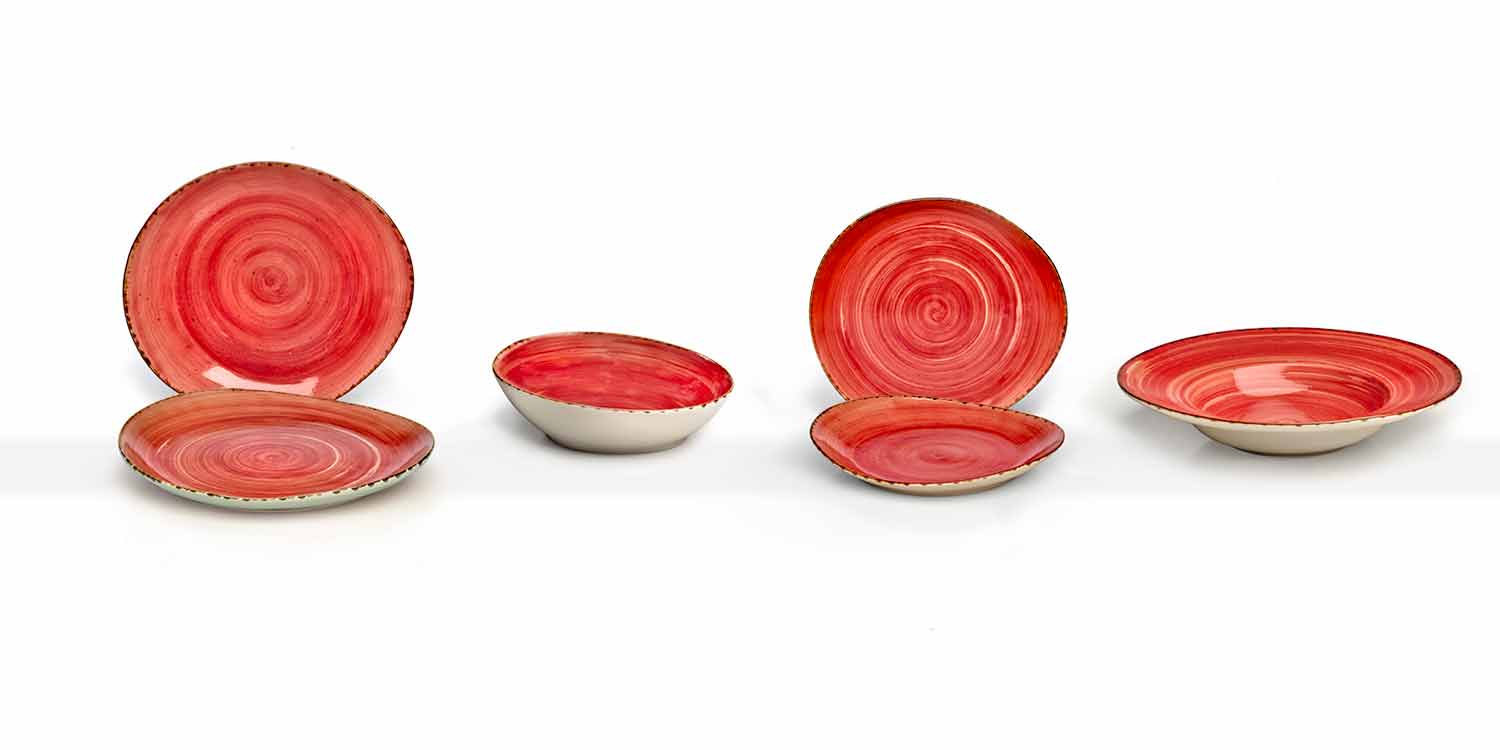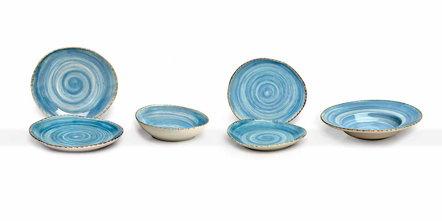 Originalidad : las formas irregulares, las decoraciones con pinceladas imprecisas y con un efecto moteado acabado y pintado a mano y el borde envejecido, resaltan el estilorústico y terroso de la colección. Cada diferencia entre una pieza y otra debe considerarse como una característica adicional de valor y personalidad, que hace que cada pieza sea única.
