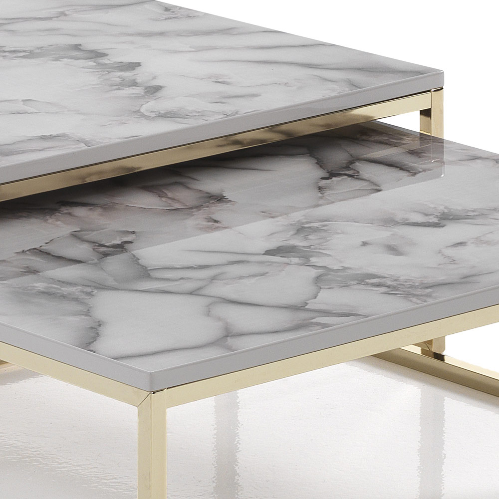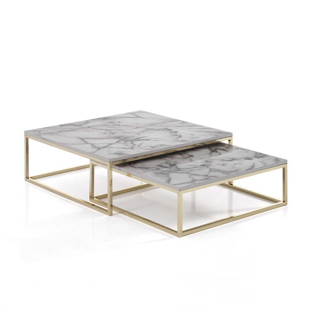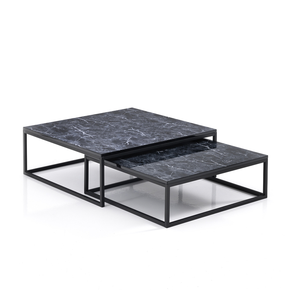 Conjunto de 2 mesas de salón con tapa fabricada en MDF revestido en melamina y estructura realizada en acero pintado, íntegramente . Este artículo de estilo moderno y refinado es perfecto para completar el mobiliario de salones, zonas de estar y ambientes contract, garantizando funcionalidad y practicidad . Los materiales elegidos para la producción son de primera calidad para ofrecer al cliente un producto completamente único.