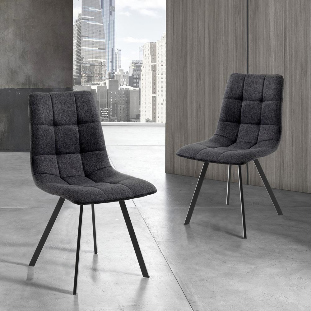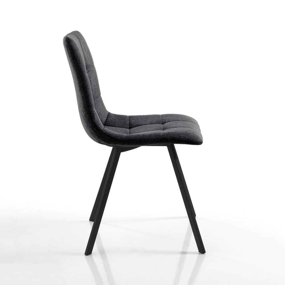 Conjunto de 4 sillas con asiento acolchado tapizado en tela color antracita y estructura íntegramente en acero pintado negro mate. Este artículo, gracias a sus acabados sencillos y elegantes , es perfecto para completar el mobiliario de cualquier salón, cocina y salón. Ofrece un asiento cómodo y confortable y una gran estabilidad gracias a la forma de las patas. Los materiales utilizados son de excelente calidad para ofrecer al cliente un producto no sólo bonito a la vista sino también práctico y funcional.