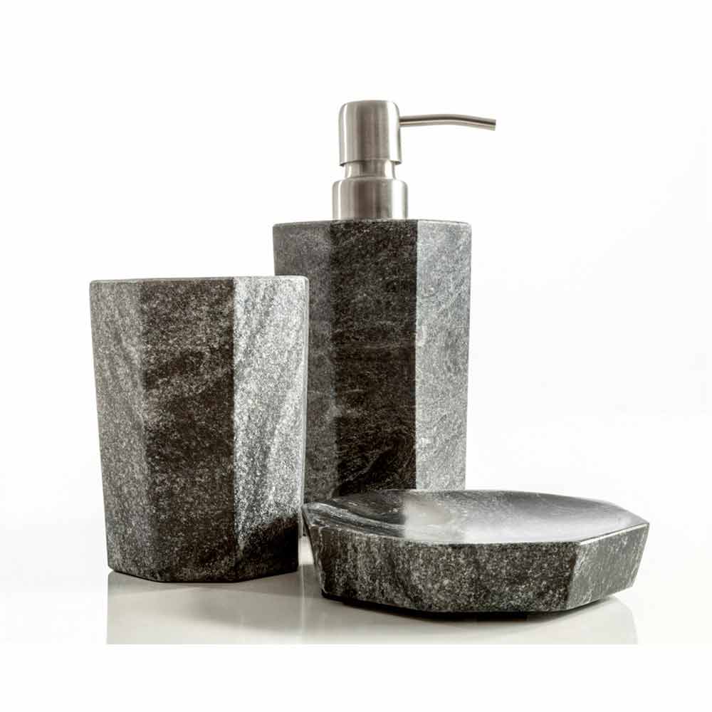 Conjunto de mármol gris veteado de modernos accesorios de baño Montafia Montiafia es el conjunto de accesorios de baño caracterizado por un diseño moderno, severo y riguroso. Fabricada en mármol gris veteado, es perfecta para decorar tu baño con estilo y seriedad.