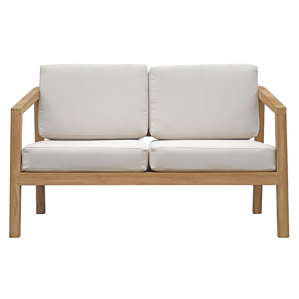 El diseño esencial y armonioso realza la textura de la madera, mientras que los amplios y cómodos asientos en tejido color crudo hacen que este conjunto sea ideal para disfrutar de momentos de puro relax al aire libre.