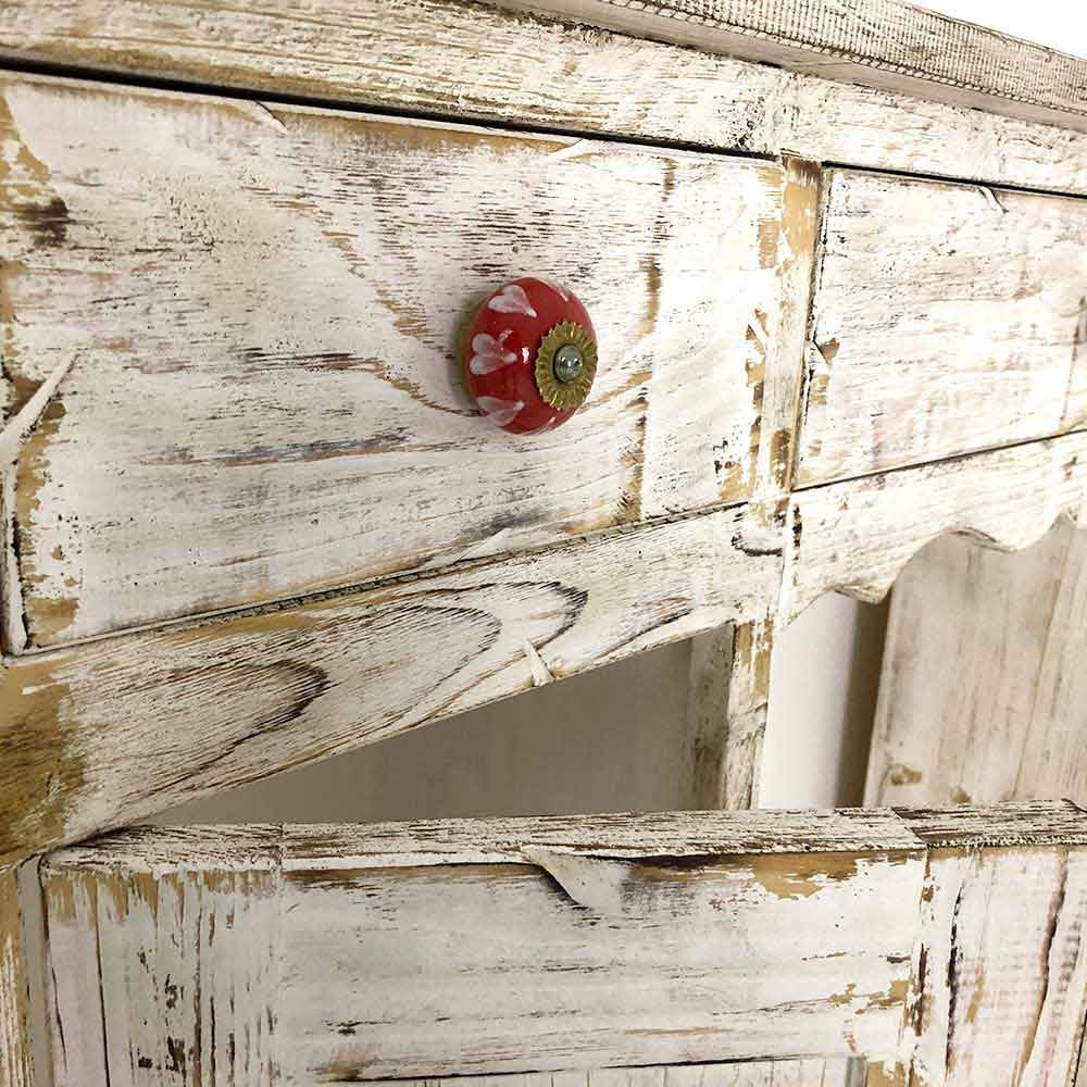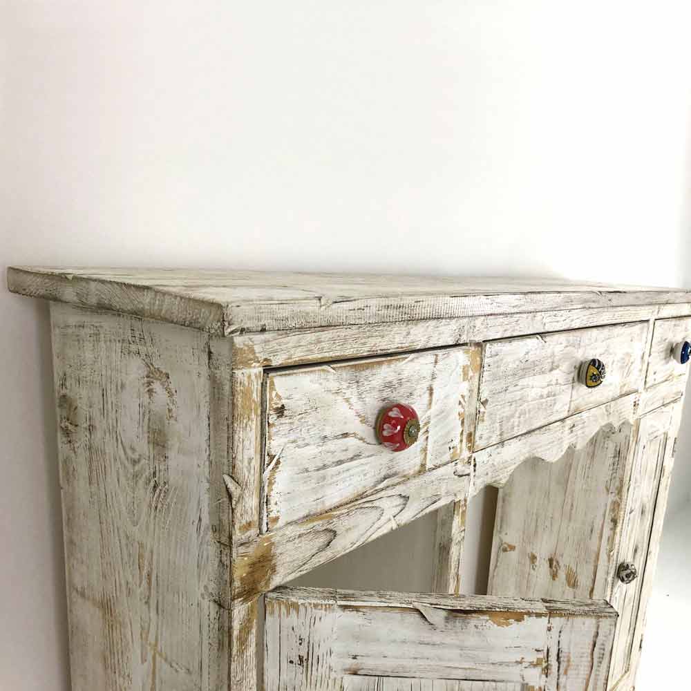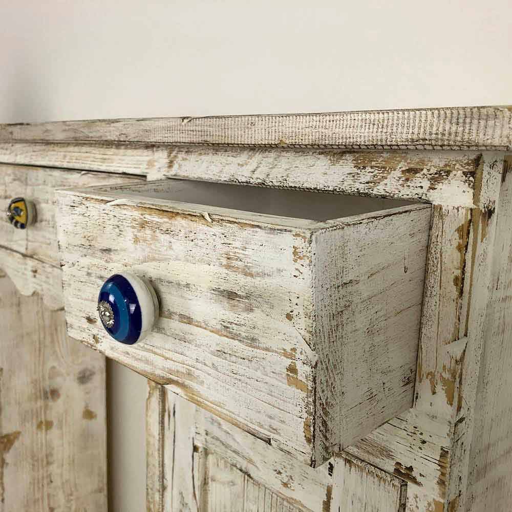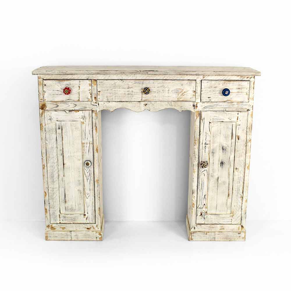 Consola en madera maciza de abeto totalmente hecha a mano en Italia y caracterizada por el maravilloso acabado desollado y blanqueado al fuego. Su estructura incluye 2 puertas con balda interna y 3 cajones que se completan con pomos de cerámica especiales pintados a mano que te permiten tener los espacios perfectamente organizados.