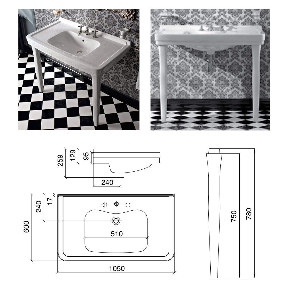 La parte superior del lavabo está equipada con soporte vertical, con 1 o 3 orificios para grifería (especifique el número de orificios necesarios al realizar el pedido) y tiene una longitud de 1050 mm.