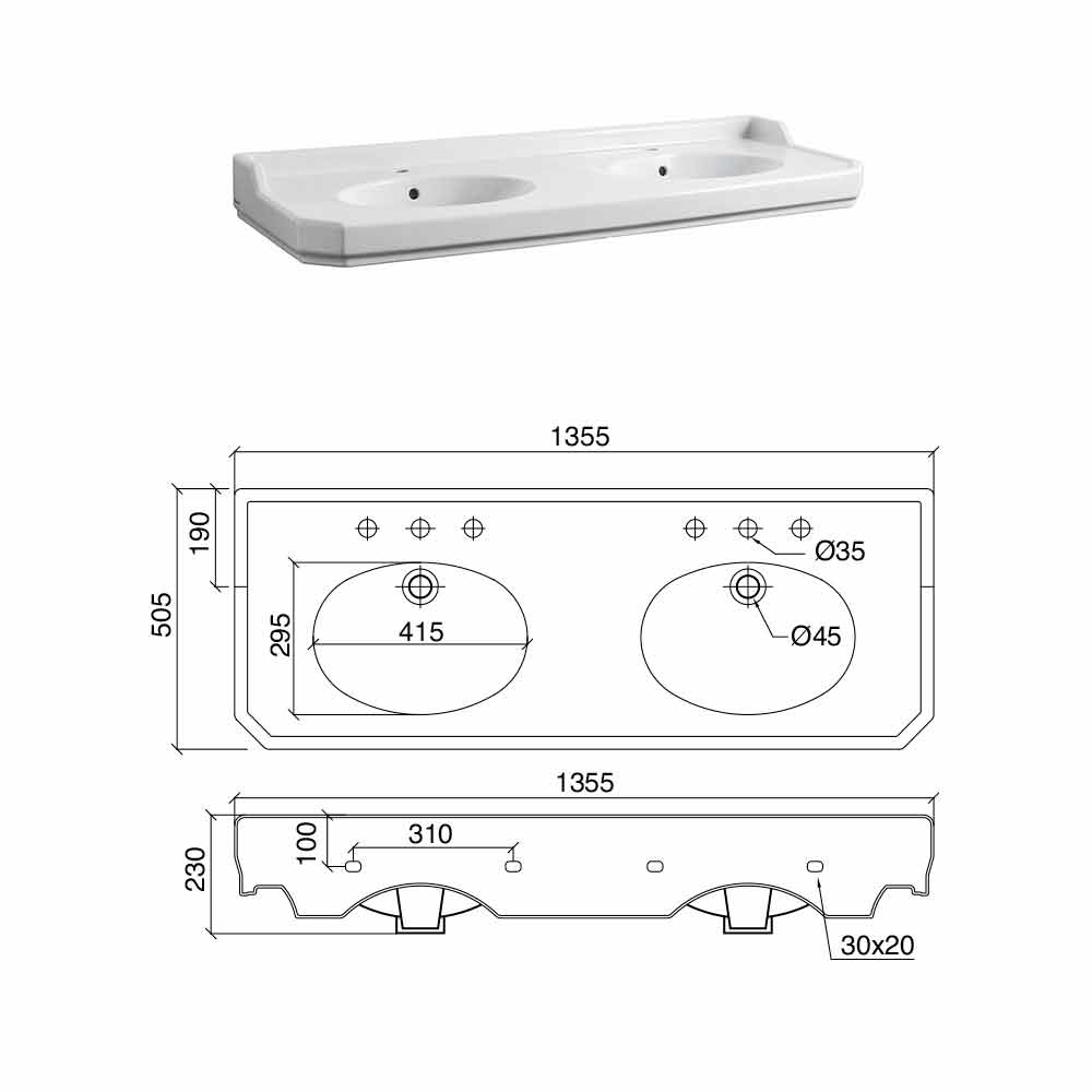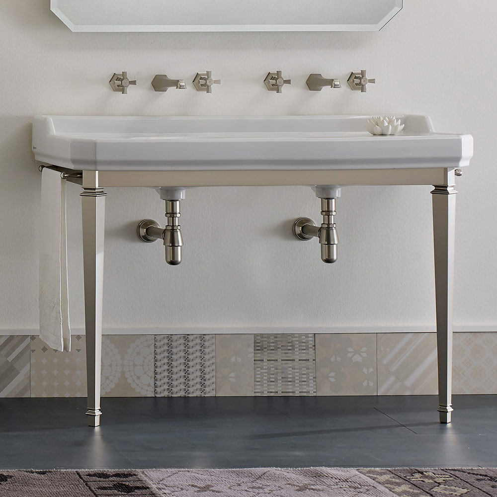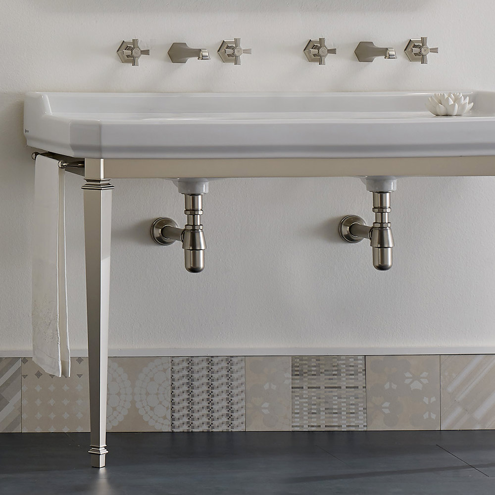 1 o 3 orificios para grifo por cuenca (especifique el número de orificios para grifo necesarios en el momento del pedido), 1350 mm de largo, sostenido por una estructura compuesta de pies de metal en el acabado de níquel .