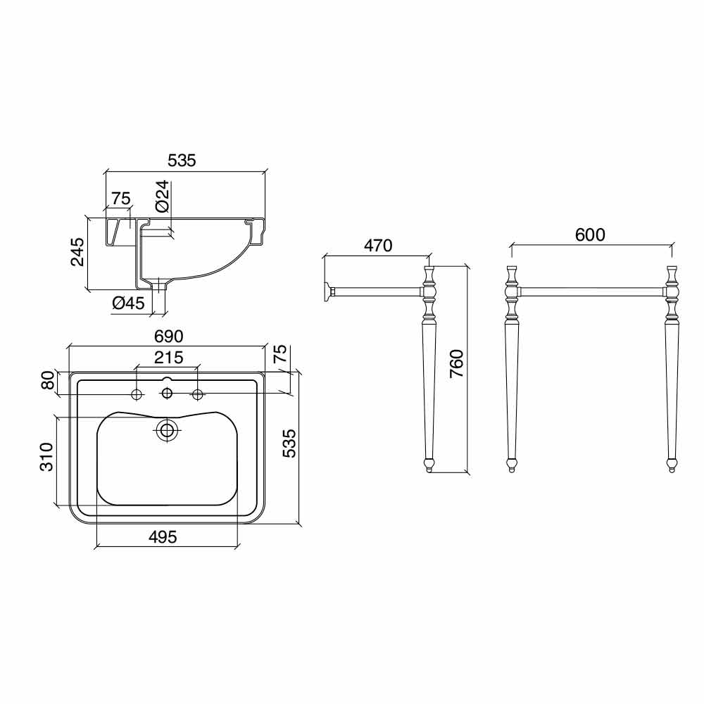 1 o 3 orificios para grifería (especificar al realizar el pedido) y tiene una longitud de 650 mm. La base está hecha de metal con acabado de níquel.
