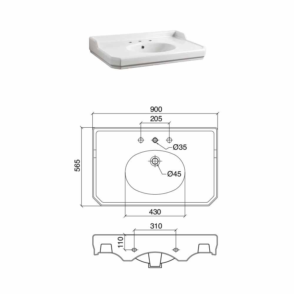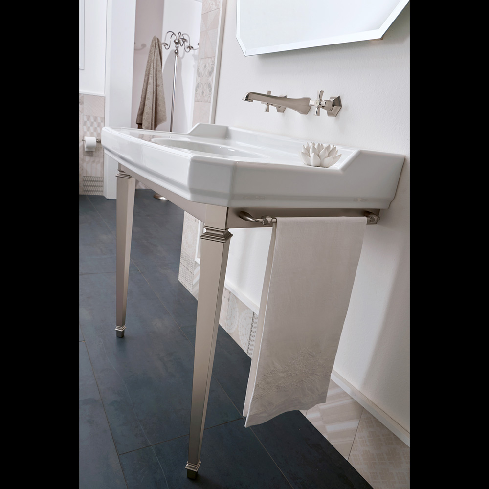 Nausica es una consola elegante compuesta por un lavabo de cerámica con salpicadero de 900 mm de largo, con 1 o 3 orificios para grifería (especifique la cantidad de orificios para grifería necesarios al realizar el pedido). Se caracteriza por un encantador estilo clásico y retro , capaz de enriquecer el baño, dándole refinamiento. Combina funcionalidad, un aspecto esencial para el área del baño y valor estético.