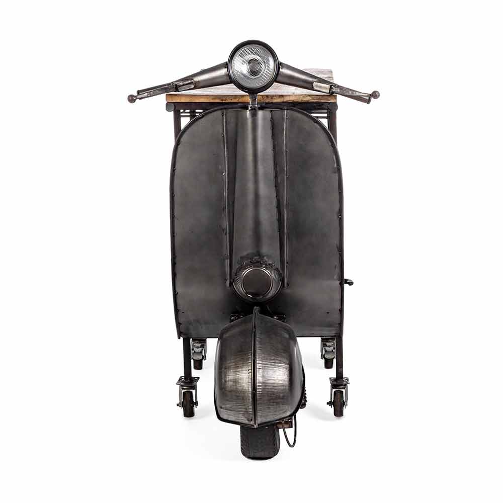 Esta consola de diseño tiene la estructura con la forma particular de una motocicleta fabricada en acero , mientras que la tapa es de madera de mango e incluye portabotellas y vasos.