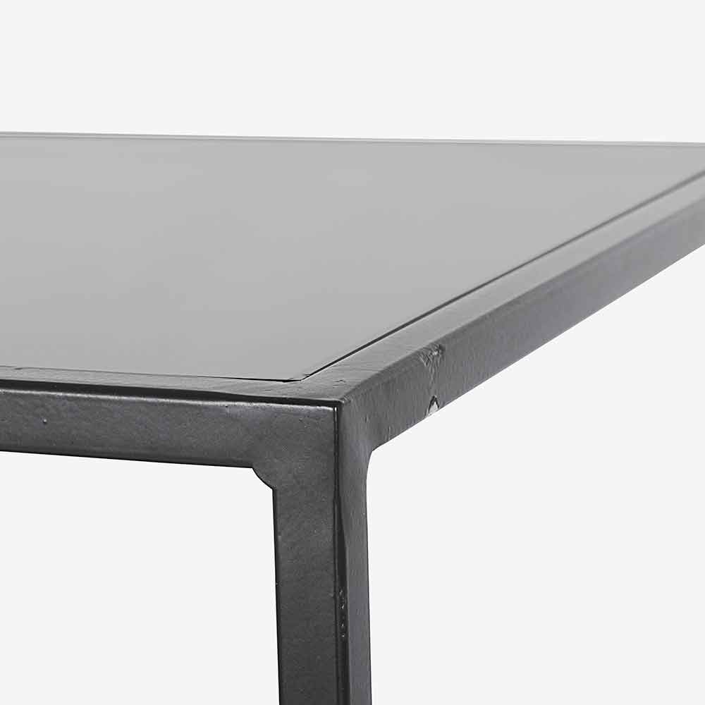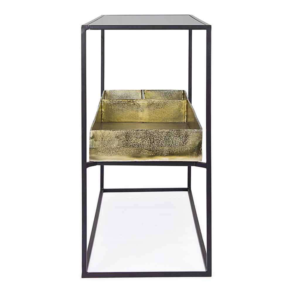 Consola rectangular estilo industrial en acero y tapa de cristal con contenedor en latón.