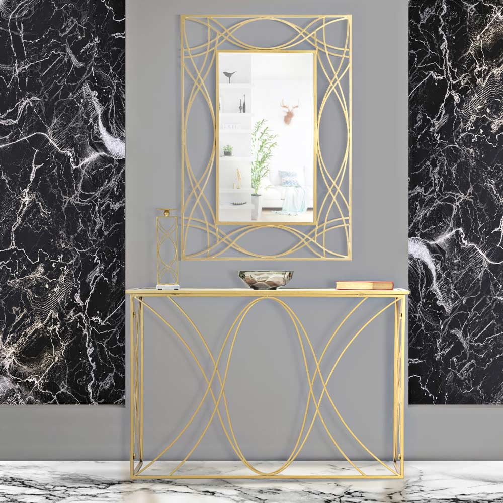 Consola de entrada fija con estructura realizada en hierro acabado dorado con tapa de espejo . Un diseño sencillo y cautivador hecho único y exclusivo gracias a la base particular que utiliza líneas sinuosas y formas geométricas para enriquecer la estética del producto dando un toque de personalidad . El resultado es una consola refinada y vanguardista , capaz de adaptarse a cualquier situación estilística moderna gracias a su versatilidad y su carácter contemporáneo.