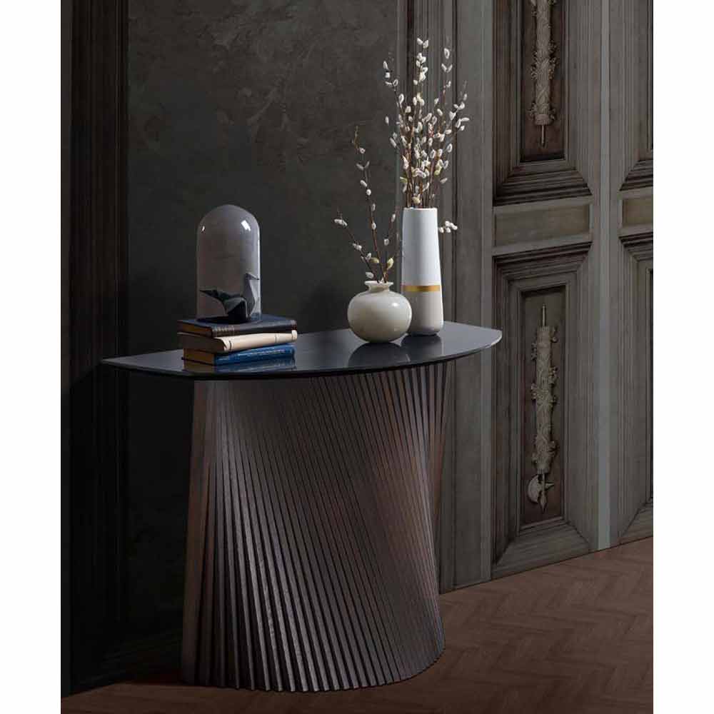 Consola fija fabricada en Italia con baseen listones de fresno engrasados a mano con acabado gris negro enriquecido por la tapa de semibarril en gres efecto mármol . Su diseño se caracteriza por la particular estructura de la base que gracias al efecto de onda que crean las tiras da una sensación de movimiento y dinamismo al propio artículo pero también a toda la estancia en la que se coloca. Escénica e imponente, esta mesa consola demuestra un carácter fuerte y una personalidad bien definida, elementos fundamentales que le permiten conquistar el centro de atención gracias también a la maravillosa combinación entre la majestuosidad de la madera y la elegancia y refinamiento del gres y sus acabados. .