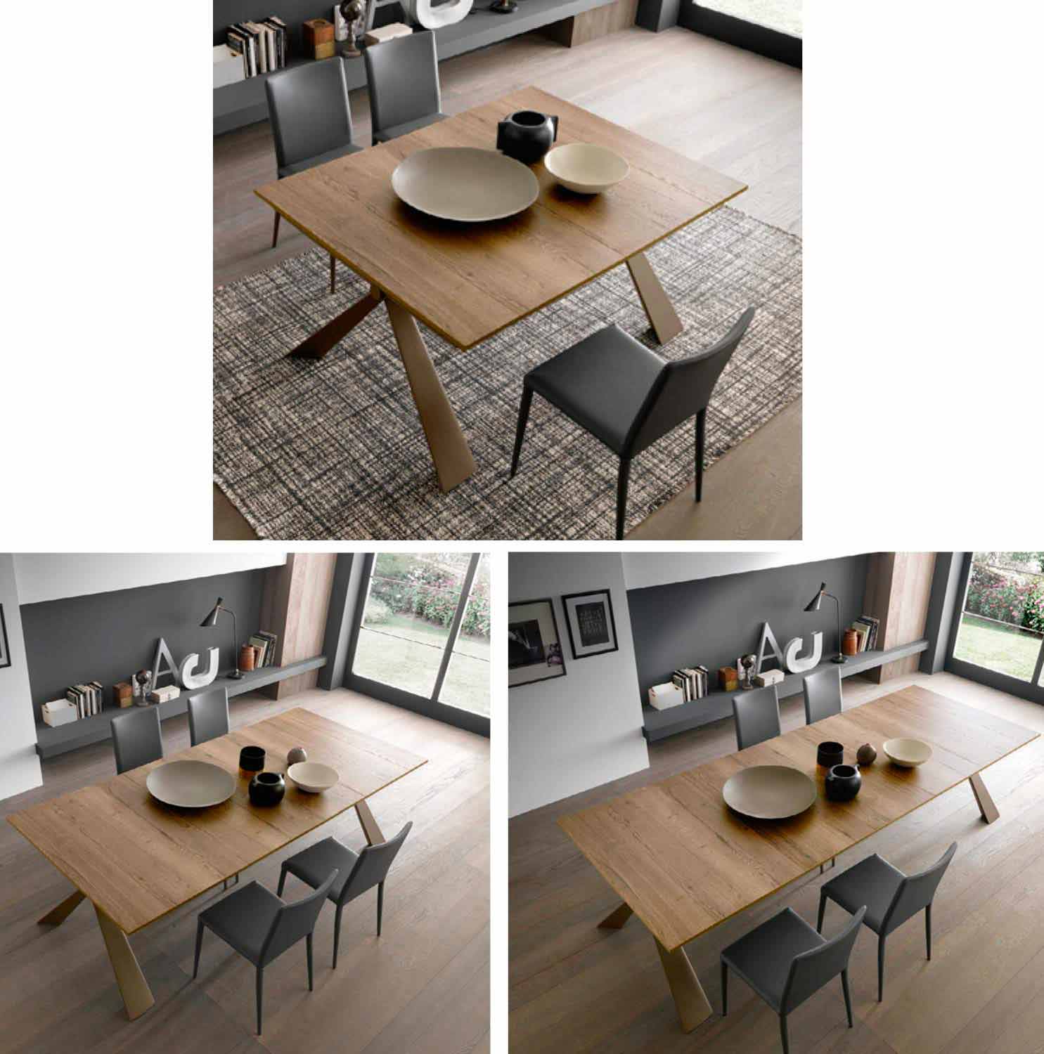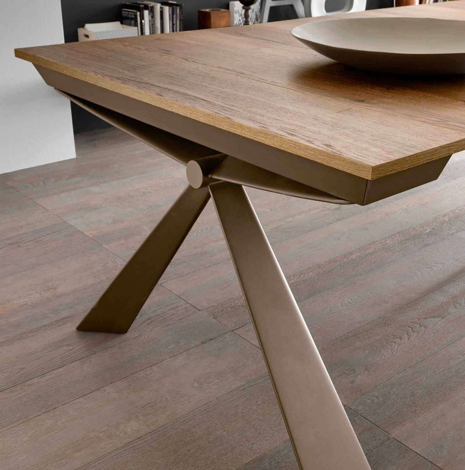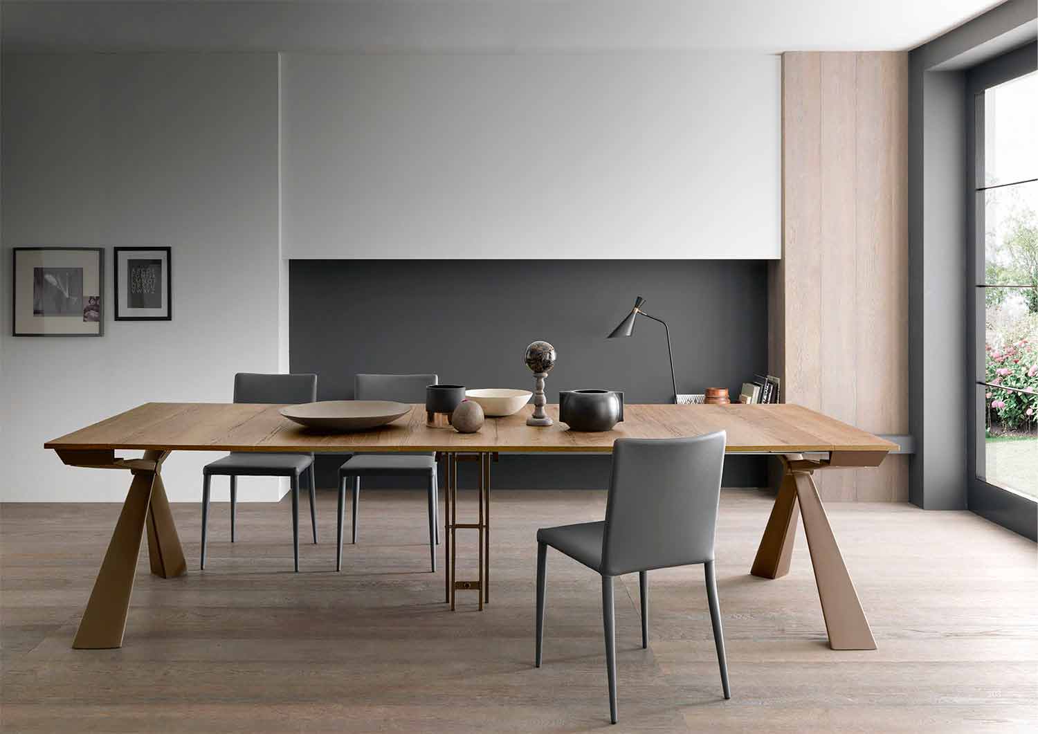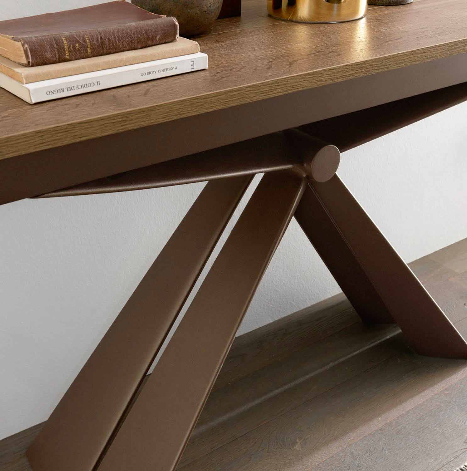 Esta consola extensible se perfila con un diseño escultórico gracias a la forma de la estructura metálica que converge sus líneas en un nodo central. El resultado, extremadamente elegante y simétrico, abraza el espacio circundante en un impacto escénico envolvente.