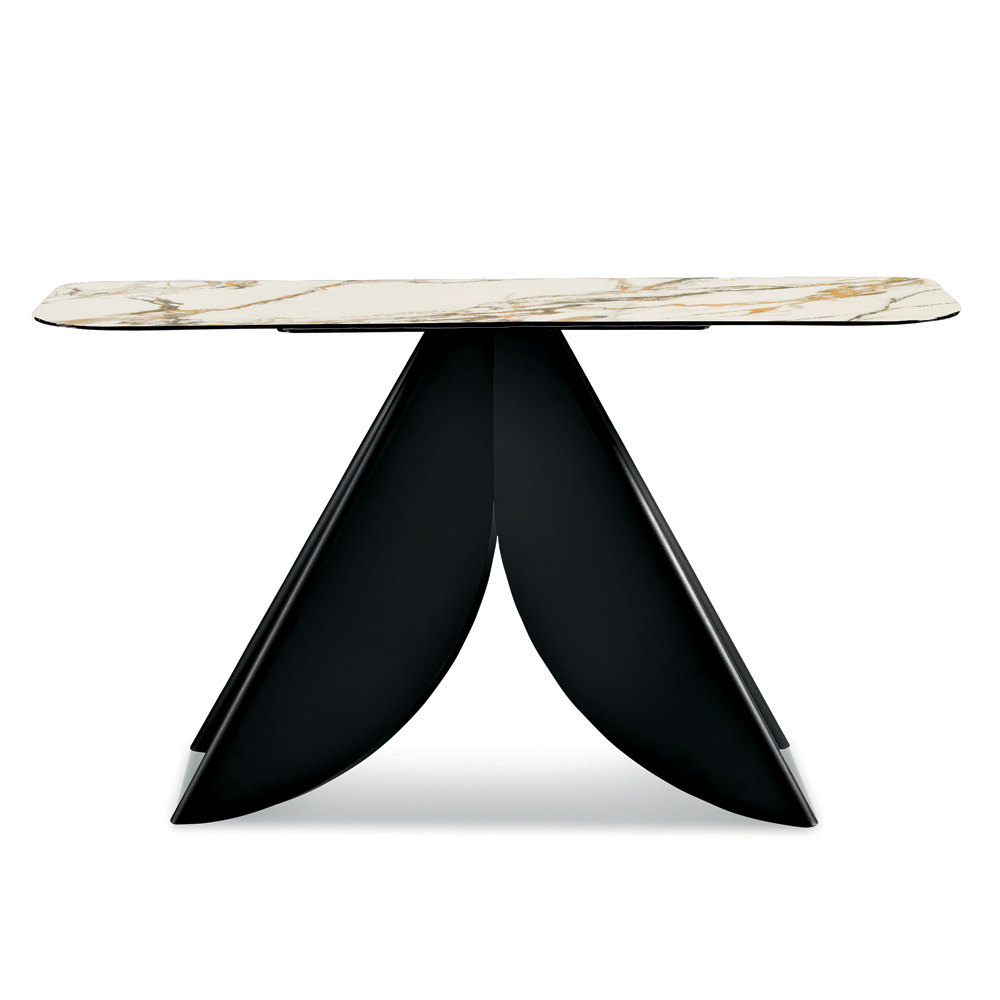 La estructura se caracteriza por una base de metal pintado compuesta por cuatro elementos curvos entrelazados que recuerdan la forma de los pétalos, creando un efecto gráfico refinado, dinámico y escenográfico.