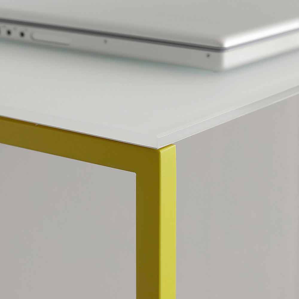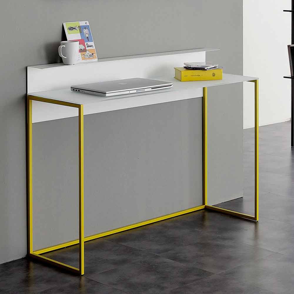 Consola de salón fabricada en Italia con tapa de cristal blanco brillante completa con salpicadero blanco y estructura de metal pintado de amarillo . Las líneas simples y esenciales dan vida a un mueble de estética sobria y versátil, ideal para revolucionar el estilo de tus estancias con un toque de color creativo y vanguardista. La posibilidad de elegir entre 3 tamaños diferentes permite que la consola satisfaga todas las necesidades permitiéndole amueblar con estilo incluso los espacios más pequeños gracias a la parte superior particularmente estrecha, que es una superficie de apoyo ideal para la entrada o la sala de estar pero que lo hace perfecto. complemento para usar también como práctico escritorio. El color excéntrico y vivo que caracteriza a toda la base le da al producto su personalidad fresca e innovadora creando una combinación perfecta junto con el elemento elegante del cristal.