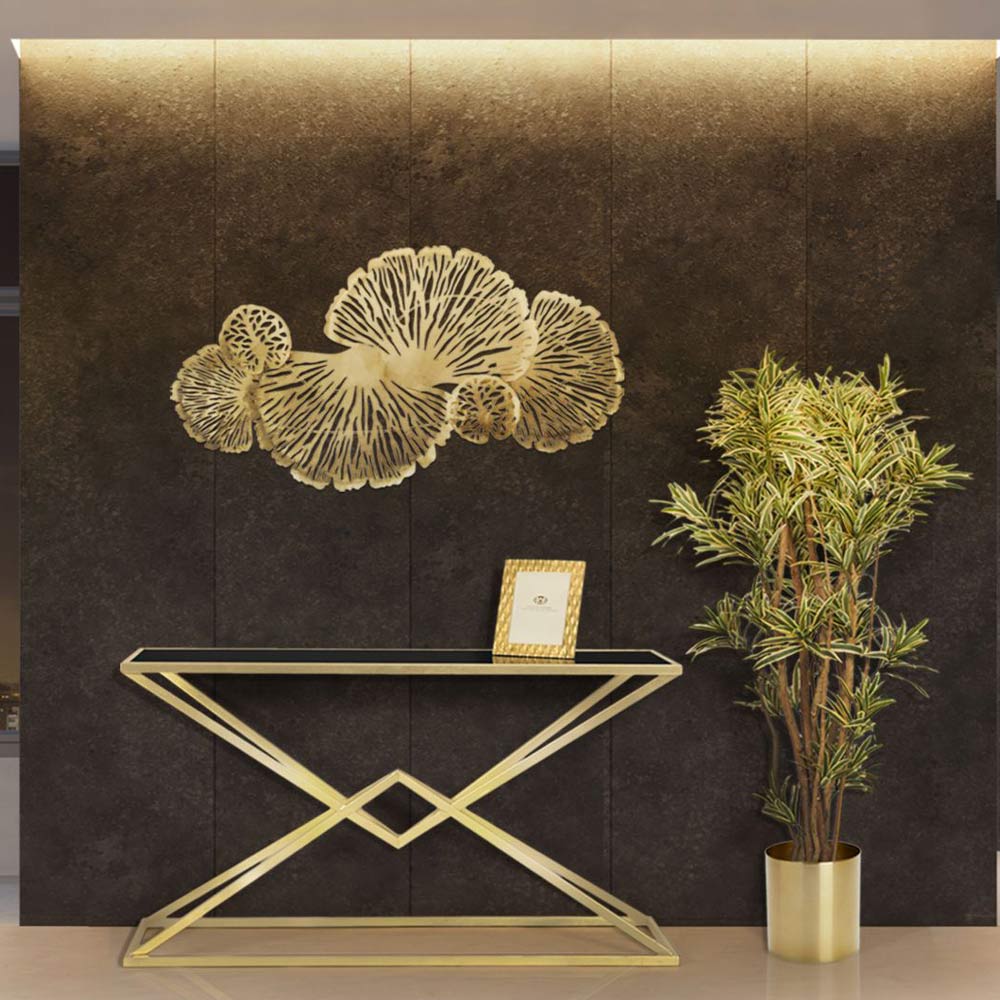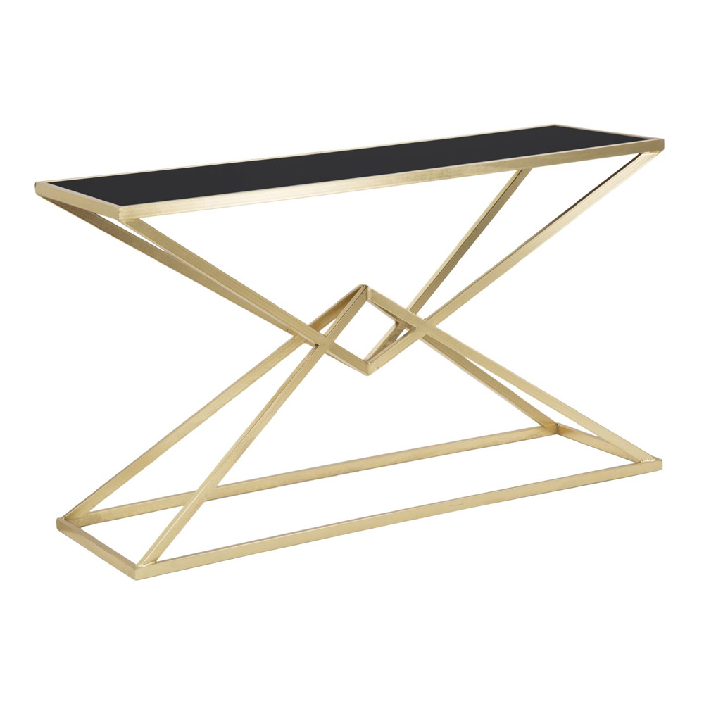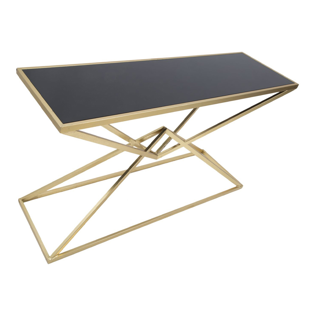 Consola fija moderna en hierro con acabado dorado con tapa de cristal negro.