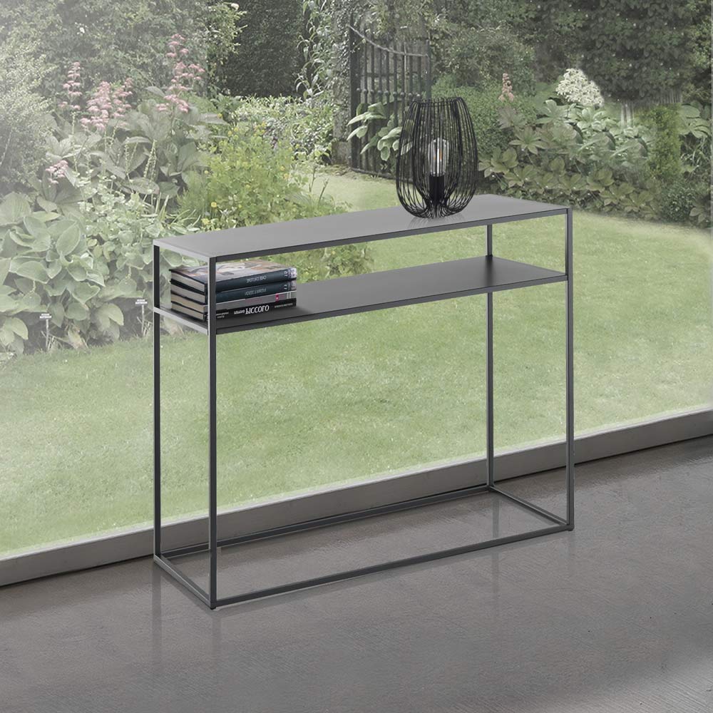 Consola fabricada con estructura de 13 x 13 mm en acero pintado antracita mate y tapa de 1,5 cm de altura y balda de acero pintado antracita mate de 1 mm de espesor. Esta consola responde a las necesidades de un cliente cada vez más atento y exigente en cuanto a calidad y funcionalidad . Dispone de dos estantes en los que podrás guardar objetos para tenerlos siempre a mano o expuestos. Garantiza estabilidad y resistencia gracias a los materiales elegidos para su construcción.