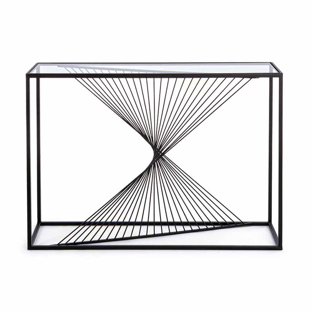 Moderna consola rectangular en acero y cristal con juego de formas.