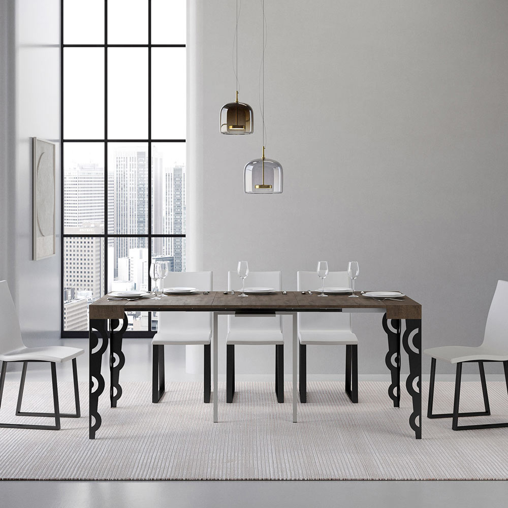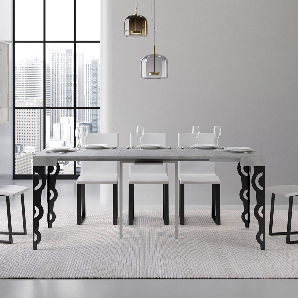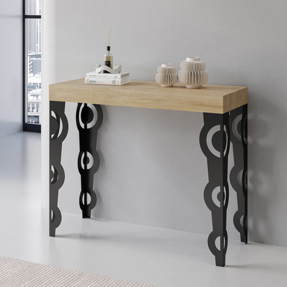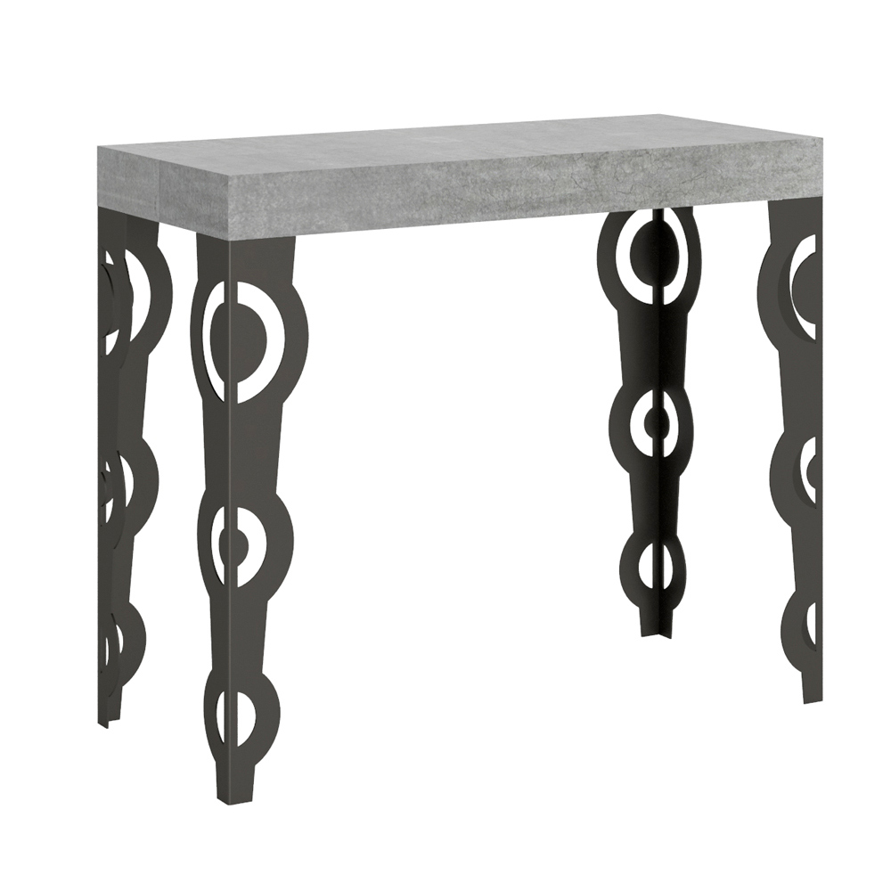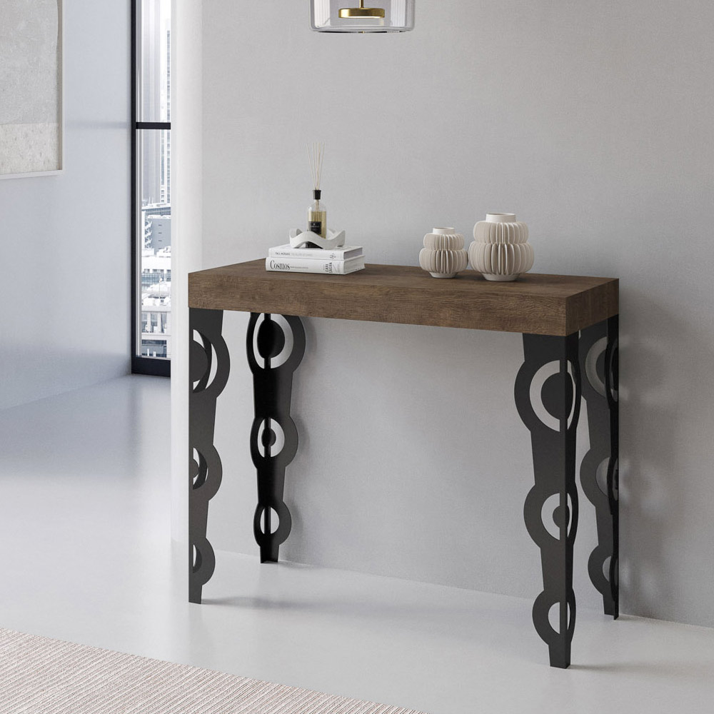 Esta consola extensible es una audaz declaración de estilo y diseño. Su parte superior le da un aire urbano y moderno, mientras que las patas esculpidas cuentan con un intrincado patrón que recuerda a las obras de arte Art Decò, dando a la pieza una personalidad y un atractivo visual.